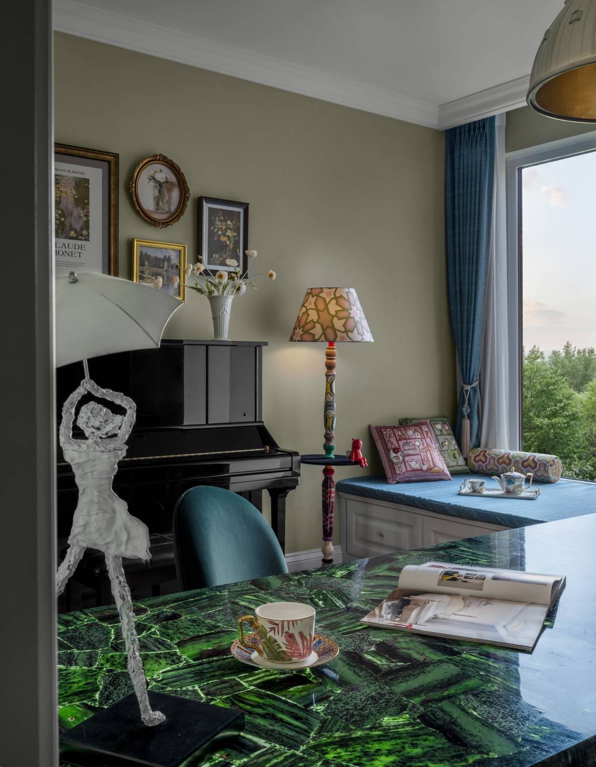 Umělecké zátiší s piánem a pohodlným sezením v okně jako stvořeným ke čtení.