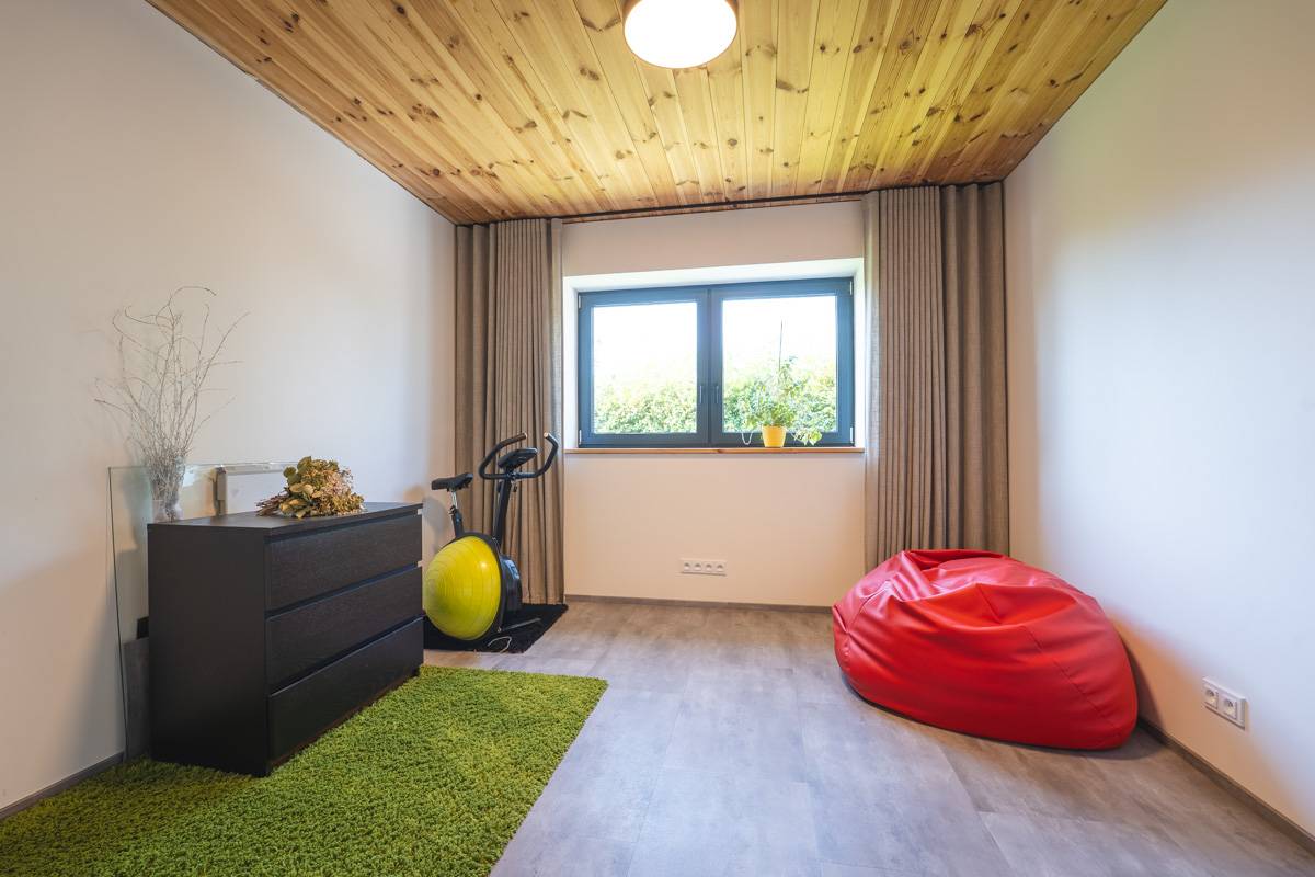 Z jídelny dále vedou dveře do prvního dětského pokoje, který prozatím slouží jako pokoj pro hosty.