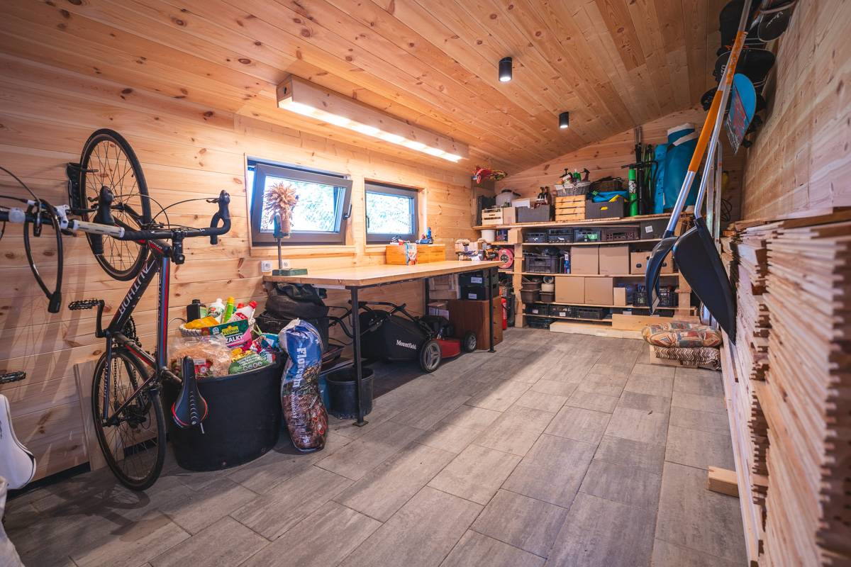Dílna nemá vlastní podlahu, stojí na venkovní dlažbě. Majitelka si zde uschovává veškeré pracovní i sportovní náčiní.