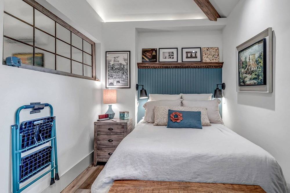 Tady vidíte pohled z druhé strany okna: je zde miniložnice, která je ale dostačující a zbylo v ní místo i na truhlu a noční stolek