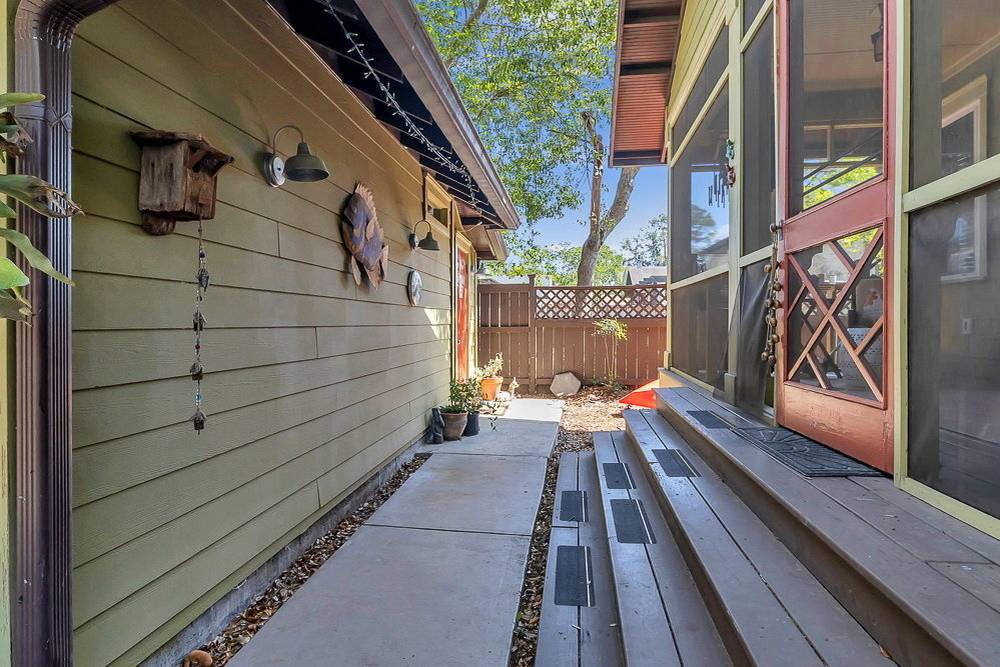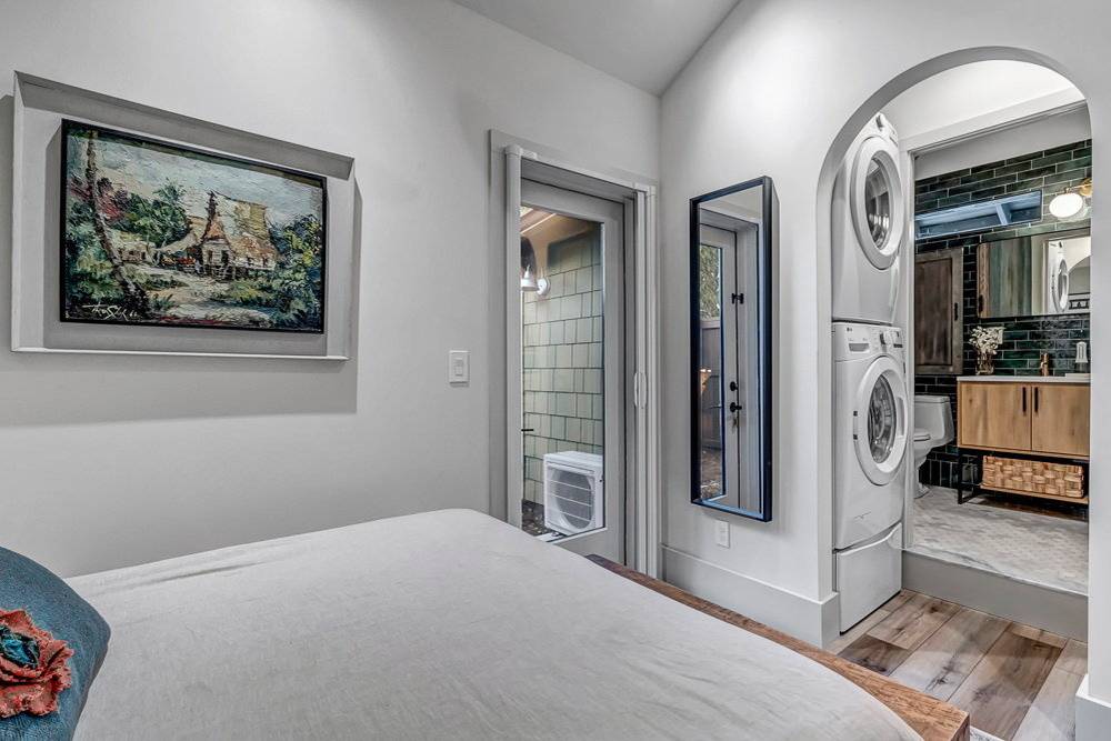 Z ložnice se stejně klenutým průchodem chodí do koupelny s WC a všimněte si chytrého umístění pračky a sušičky. Ložnice má i dveře ven na zahradu