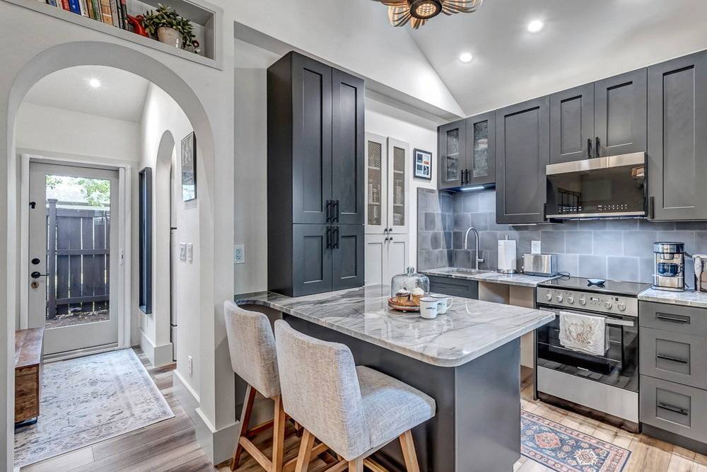 Vchází se přímo do hlavní místnosti, což je obýváček spojený s kuchyní. Pro miniknihovnu byla využita nika nad průchodem do ložnice