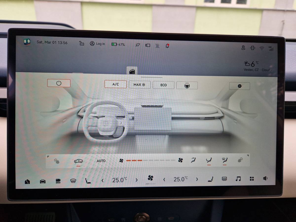 Také klimatizaci si nastavujete přes dotykovou obrazovku. Podobně jako některá jiná čínská auta, i tady je to s ideální teplotou trochu jinak. Aby ventilace foukala teplejší vzduch, musí být nastavená na 26 stupňů a více.