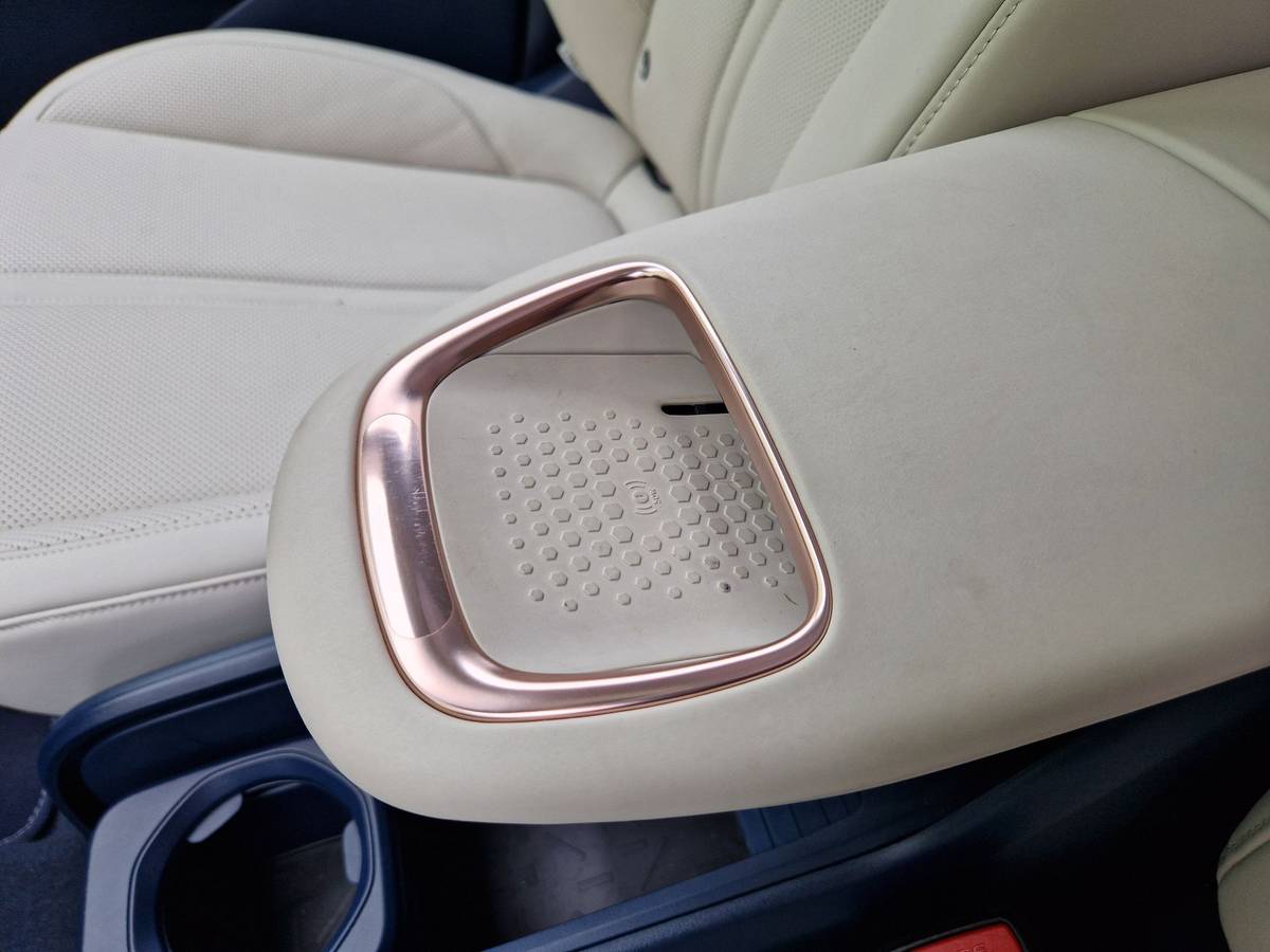 Tady je schovaná bezdrátová nabíječka na telefon, materiály by ale i tady mohly být kvalitnější.