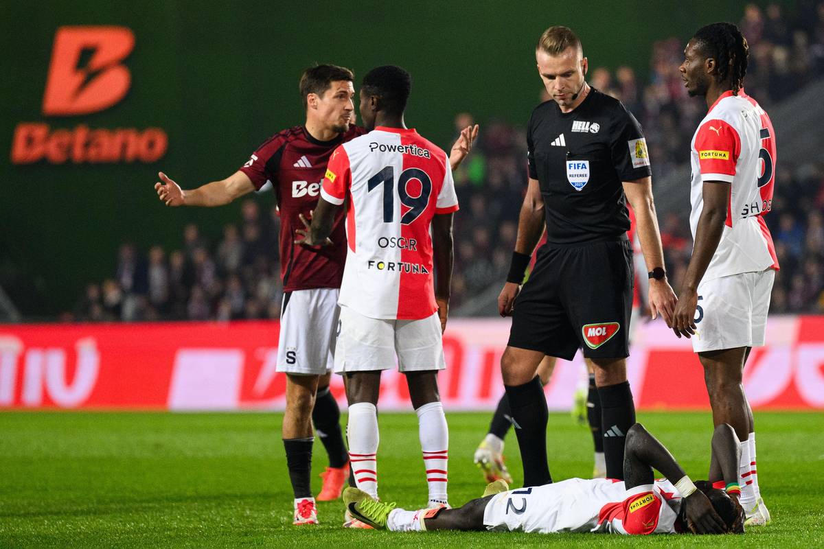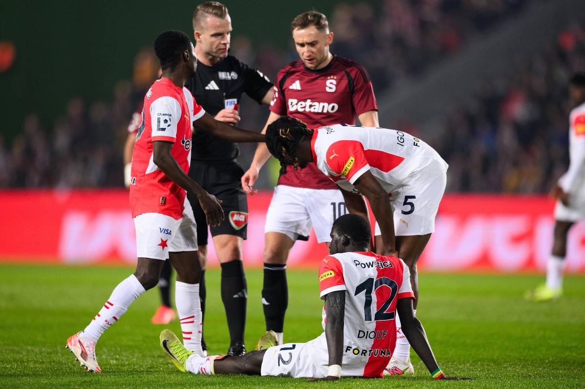 Zraněný El Hadji Malick Diouf (12) ze Slavie, Igoh Ogbu, rozhodčí Karel Rouček a Jan Kuchta ze Sparty.