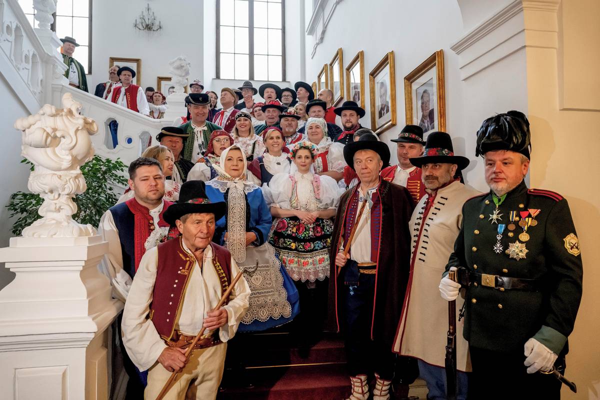 Poslanci v lidových krojích v sále Státních aktů.
