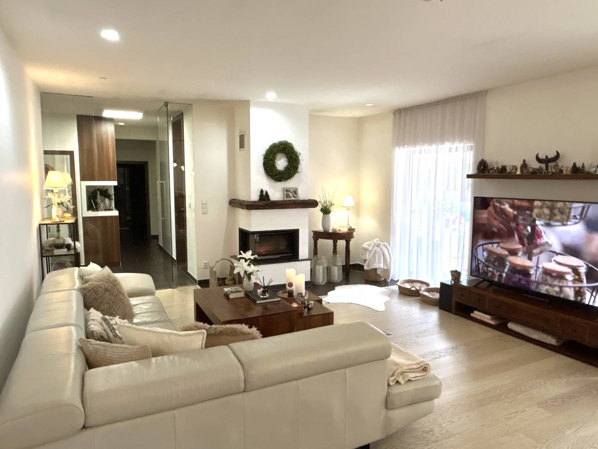 Celý dům je laděný do přírodních tónů ve spojení s bílou