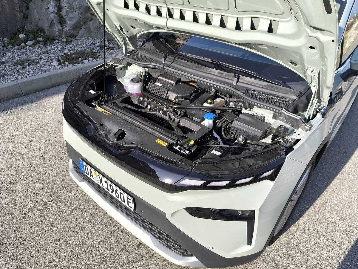 Pod přední kapotou je pouze výkonová elektronika, samotný motor sedí nad zadní nápravou a pohání zadní kola.