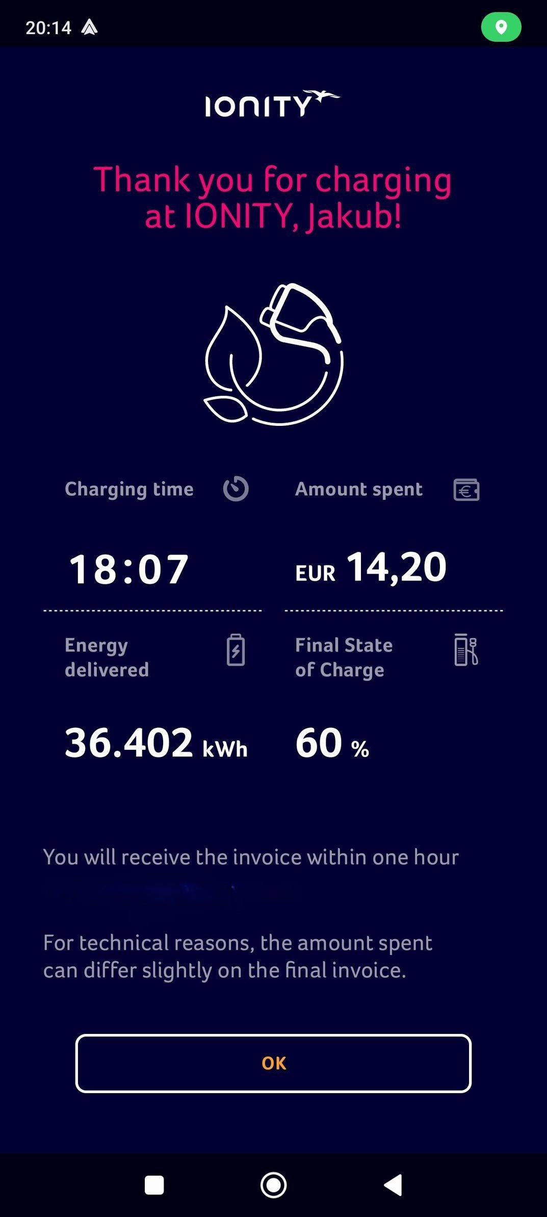 Screenshot aplikace Ionity. Přehledně ukazuje, kolik auto dobilo, jak dlouho to trvalo a na kolik peněz to vyšlo.