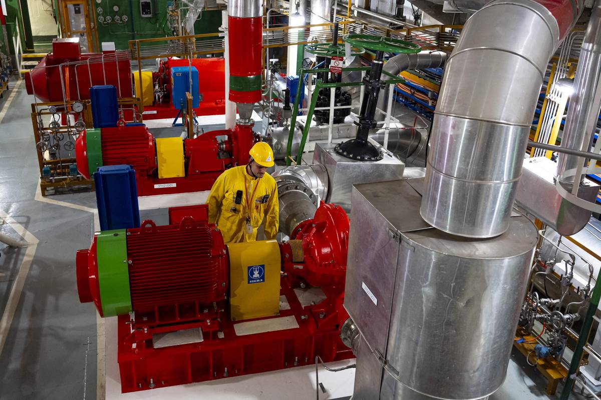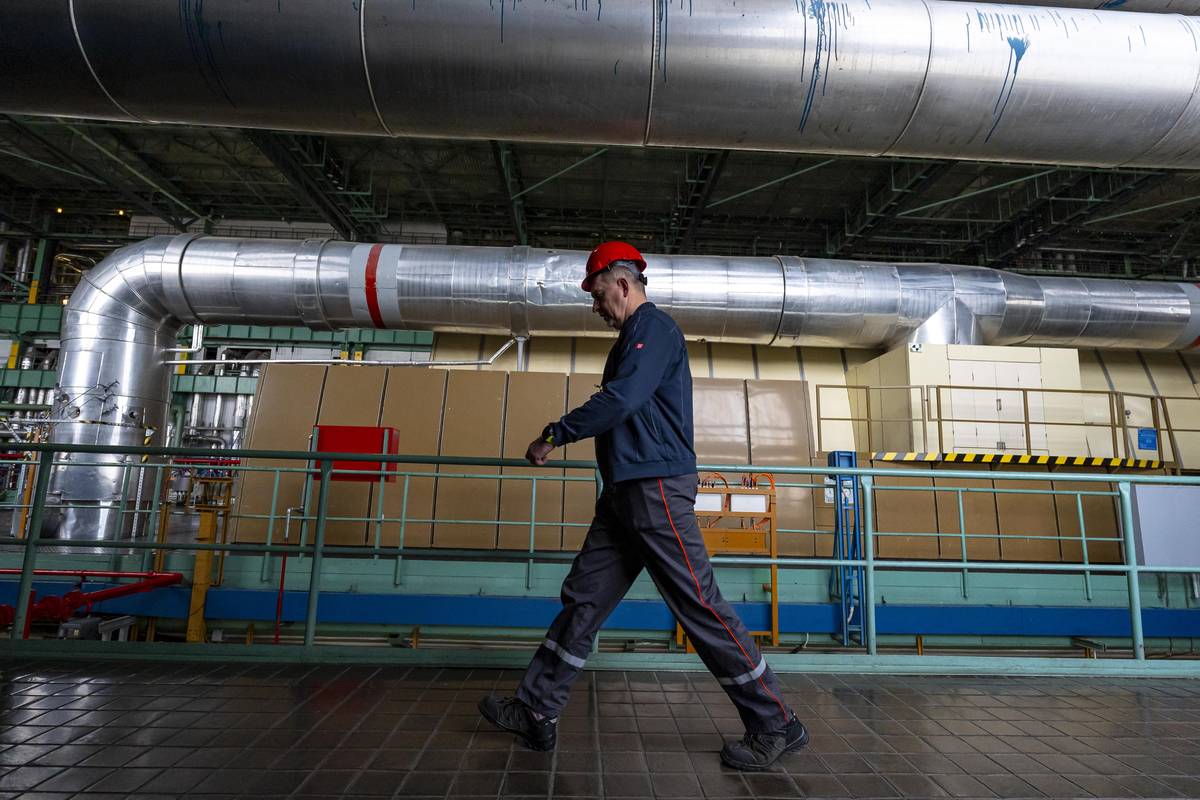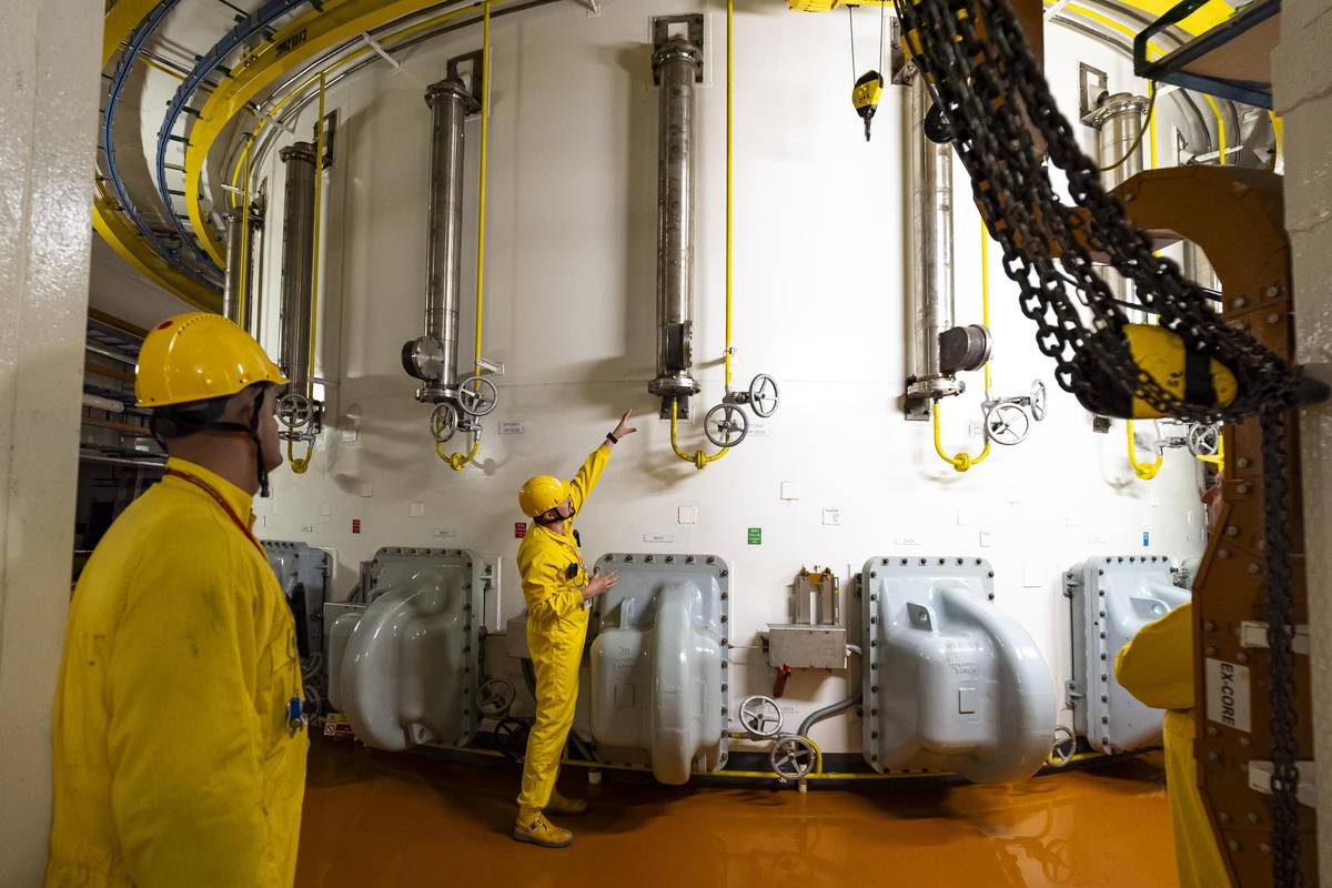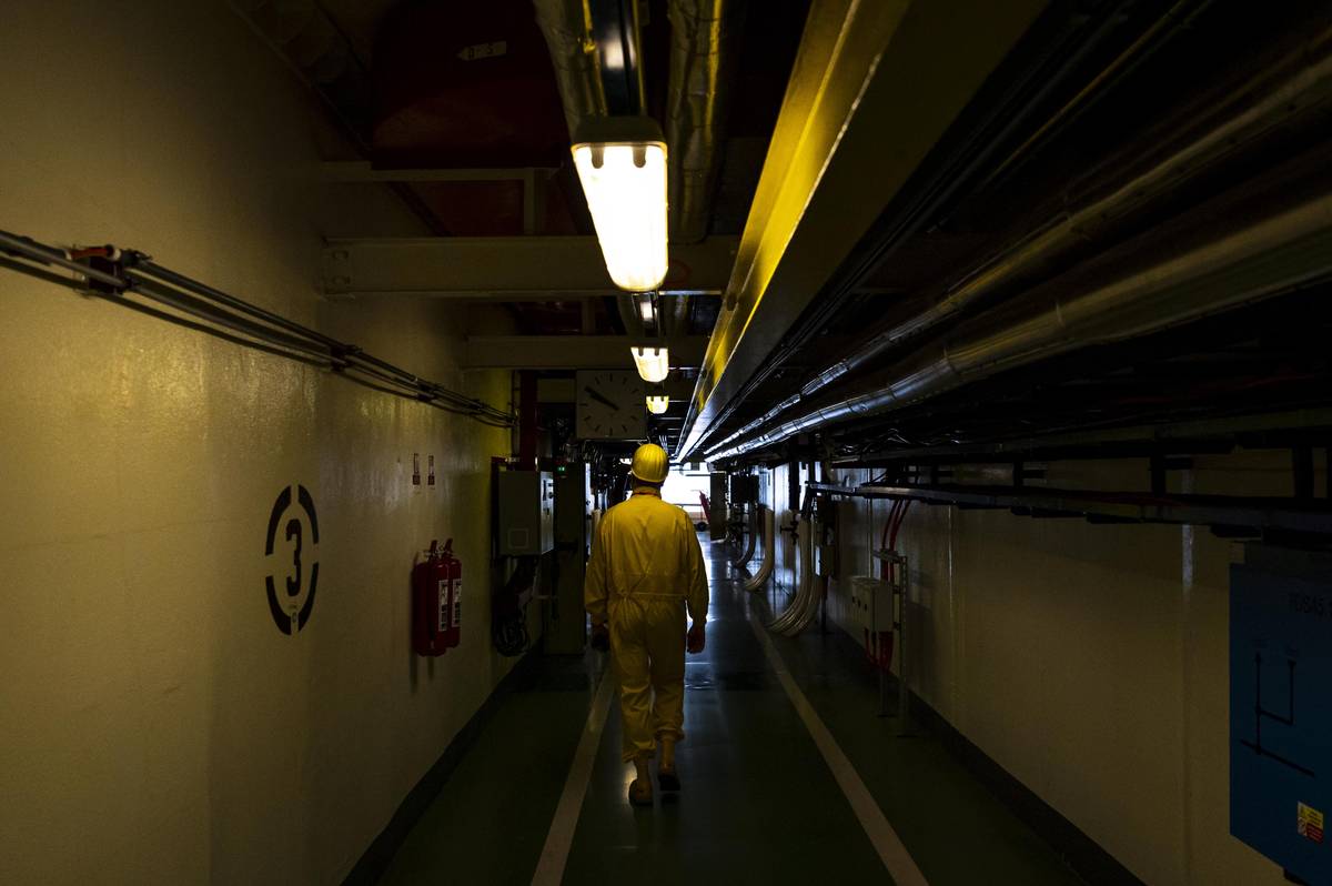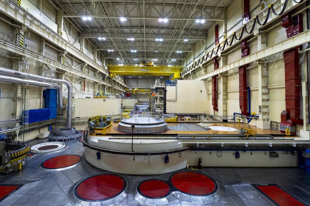Reaktorový sál druhého dvojbloku s reaktory č. 3 a 4, jejichž kulatá víka jsou vidět na protilehlých stranách haly. I když reaktory běží na plný výkon, všude je naprosté ticho, slyšet je jen klimatizační jednotka.
