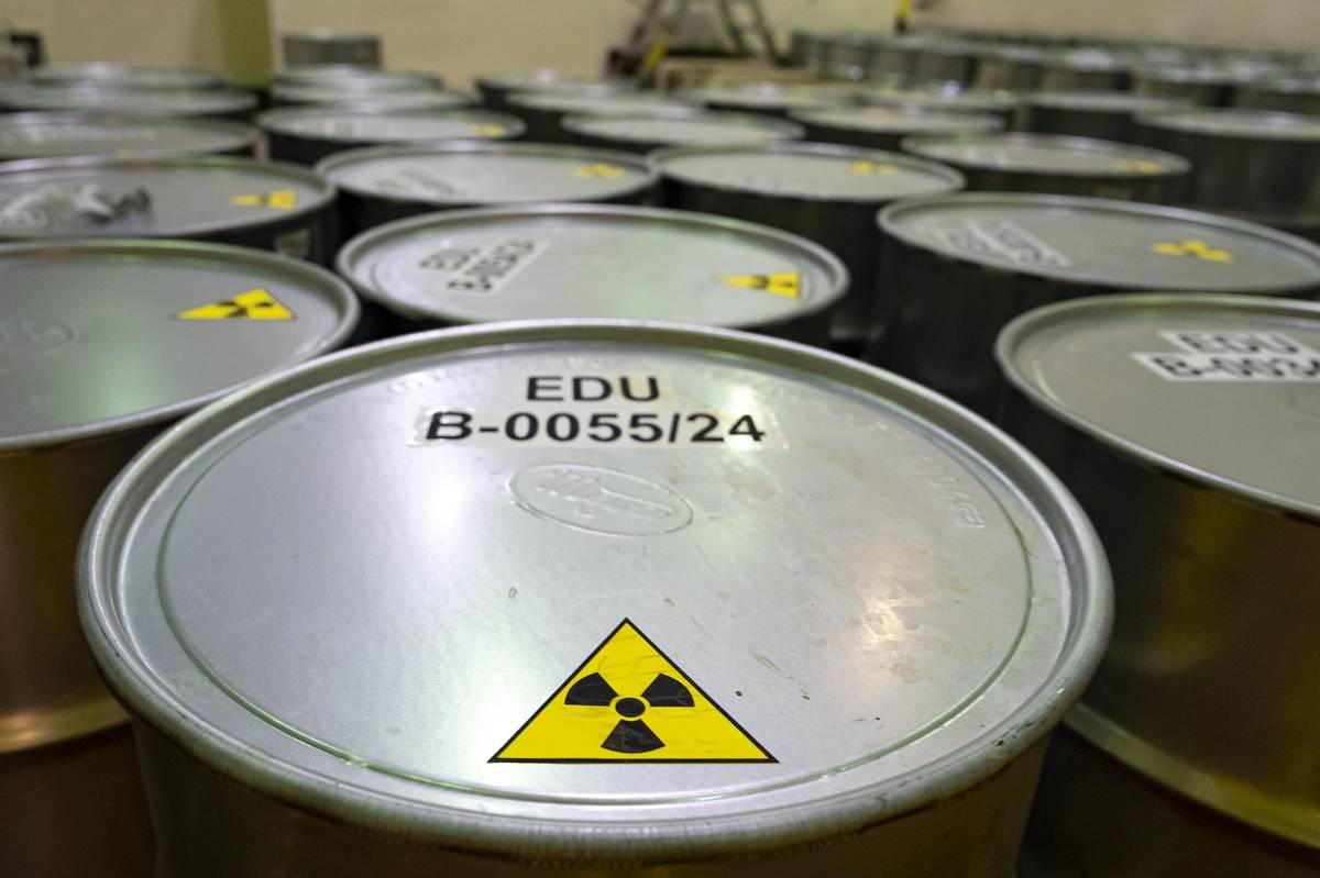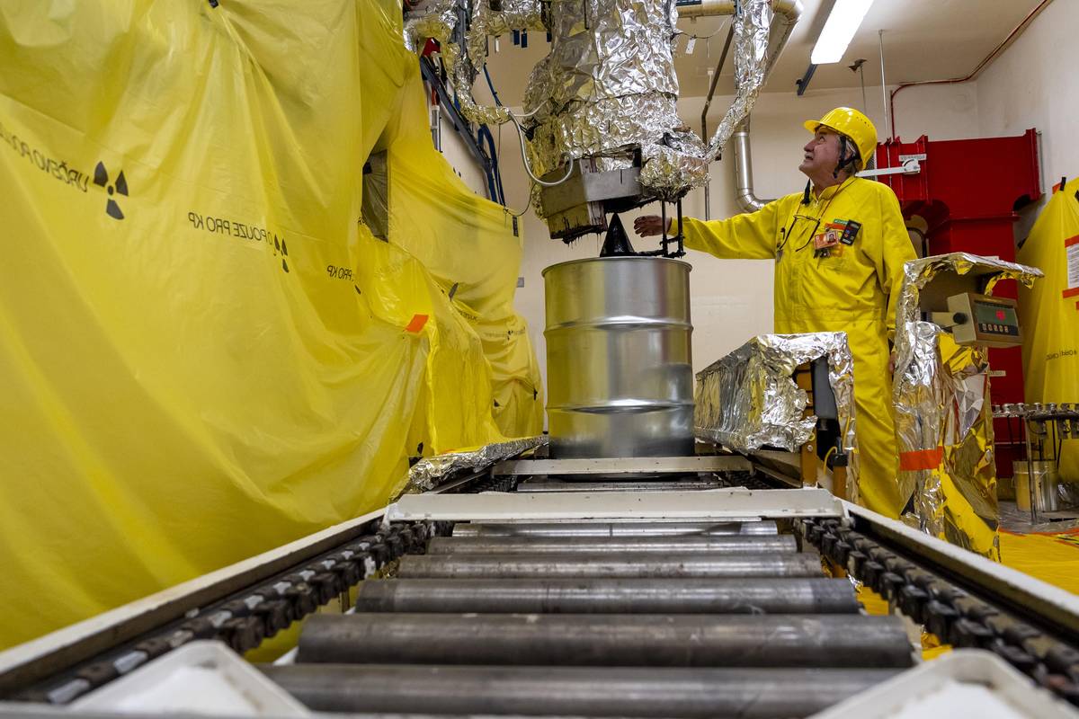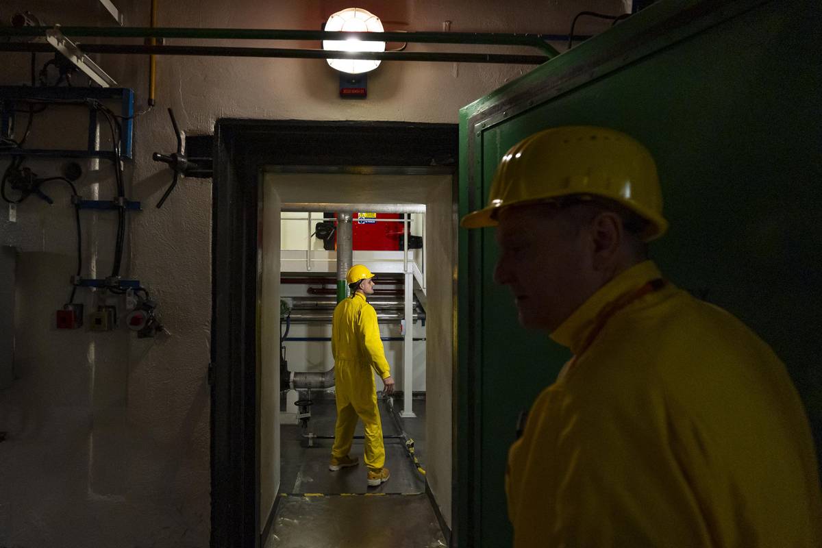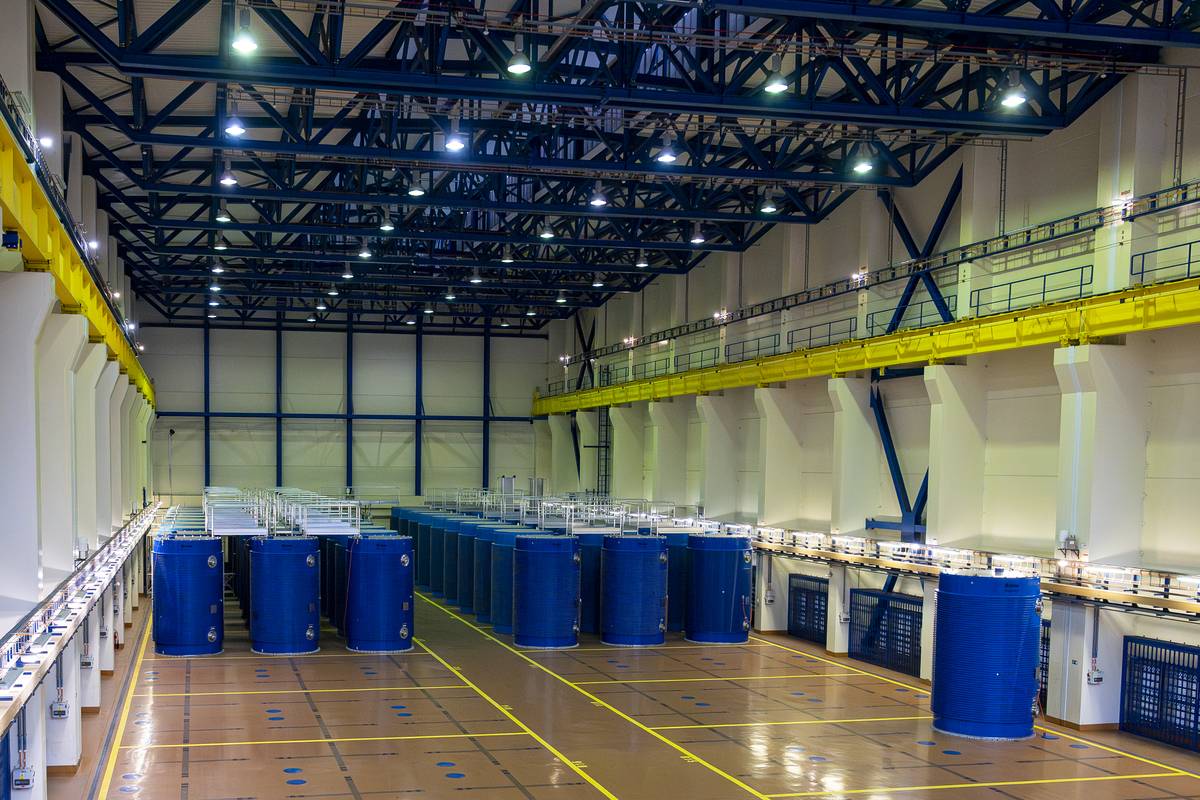 Kontejnery s použitým palivem v jednom ze dvou meziskladů v areálu. Tato část je spolu s reaktorovým sálem pod neustálým dohledem online kamer Mezinárodní agentury pro atomovou energii. V celém provozu panuje absolutní čistota, nikde se nenajde asi zrnko prachu.