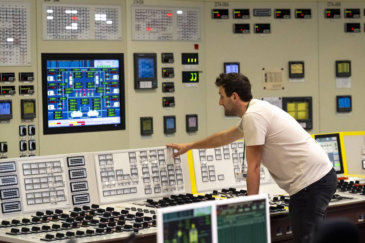 Operátoři blokové dozorny při výcviku. V takzvané blokovce se sbíhají informace o teplotách, tlacích a dalších parametrech zařízení uvnitř celé elektrárny. Odtud se řídí chod celé jaderné elektrárny.