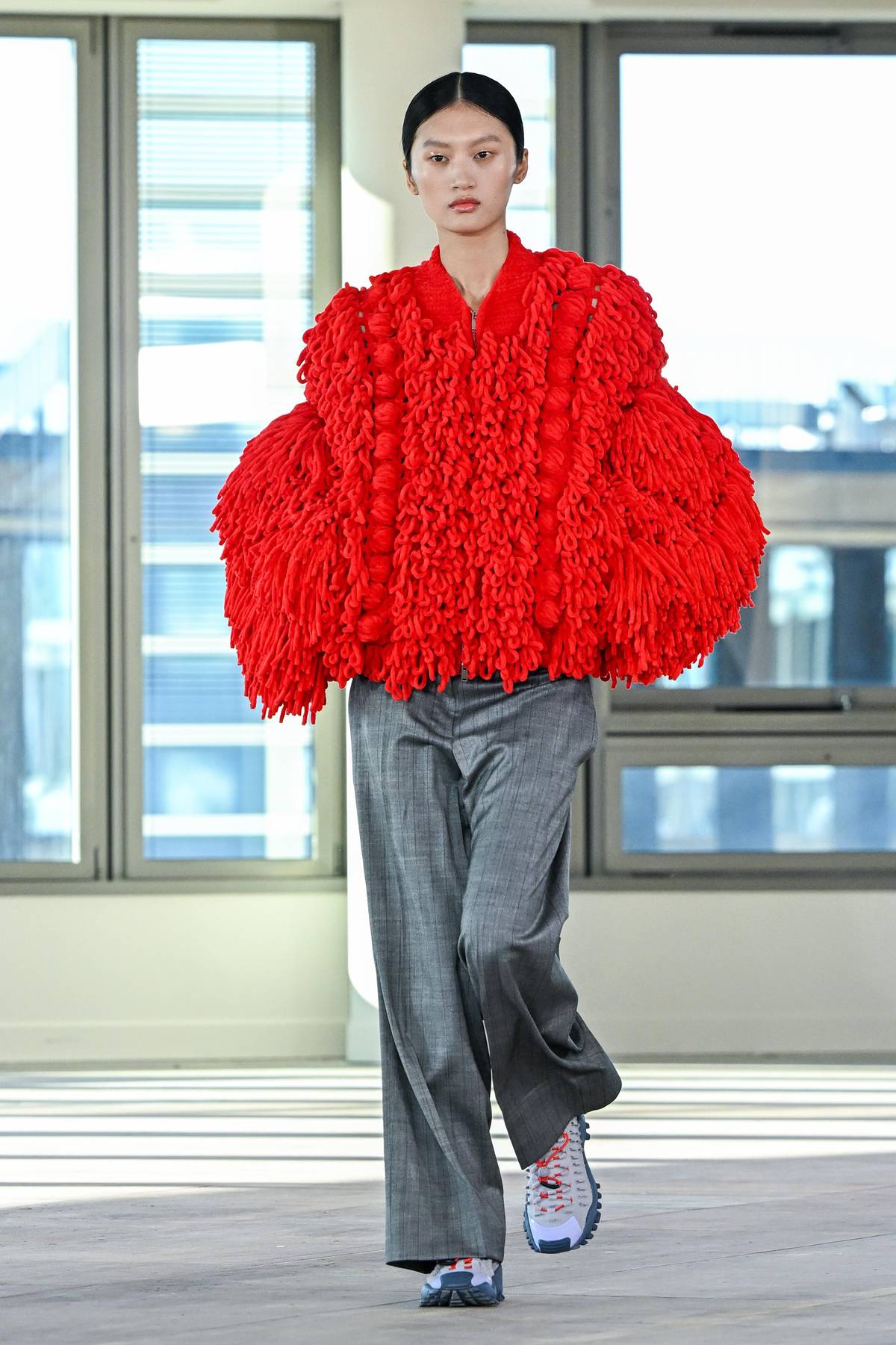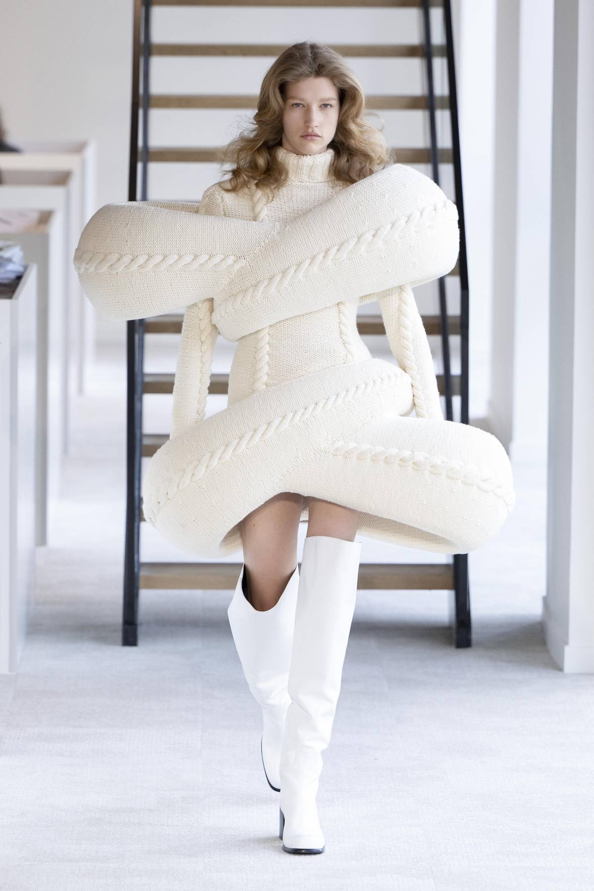 Duran Lantink. Návrhář sice umí provokovat, ale i navrhovat a snít. Vytvořil jedny z nejunikátnějších pletených šatů na fashion weeku