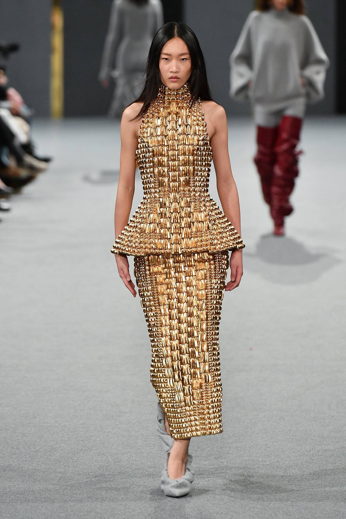 Duran Lantink. Návrhář zvedl ramena až k uším a šaty vymodeloval do siluety přesýpacích hodin