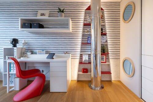 Z vestavěné skříně se odstranila pouze čelní dvířka. Gabriela Benková je dotvořila symbolem ponorkových oken, výplň mají z plexiskla.