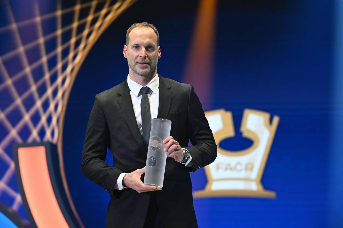 Petr Čech s trofejí pro Diamantového Fotbalistu roku.