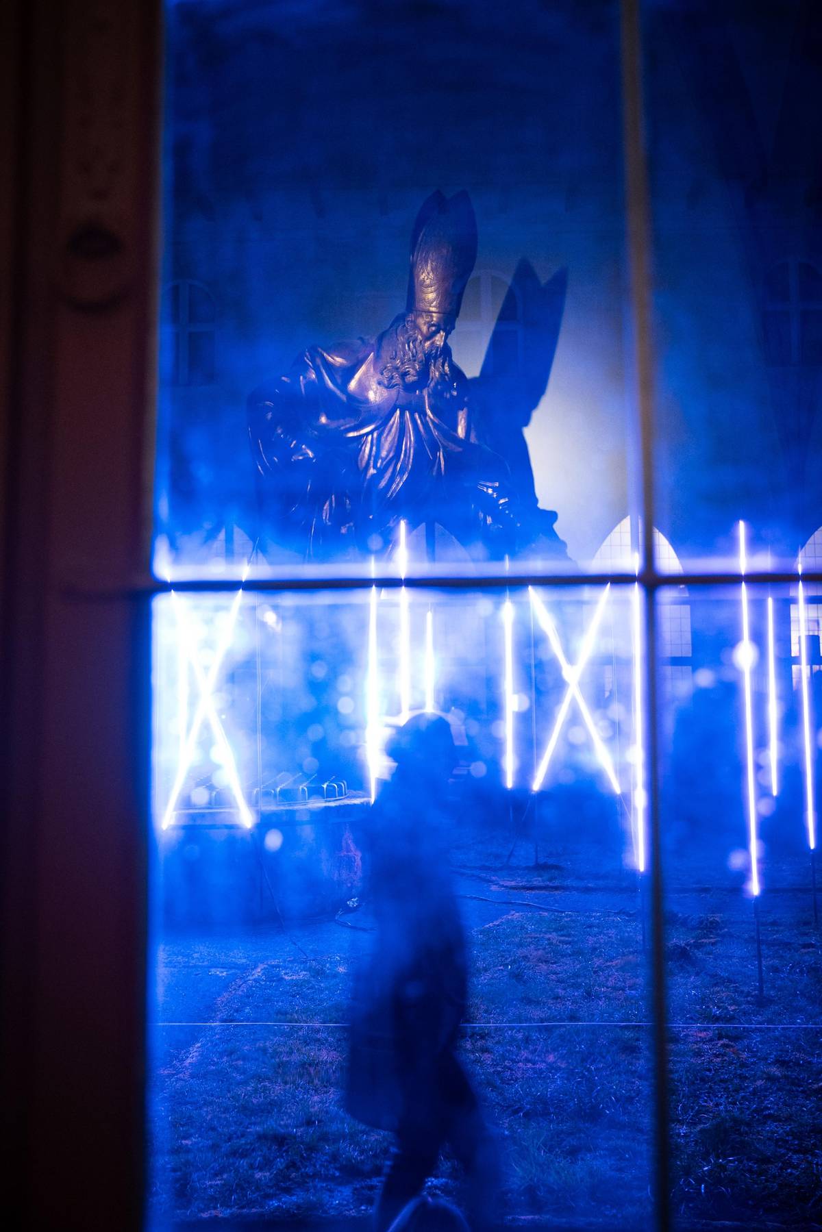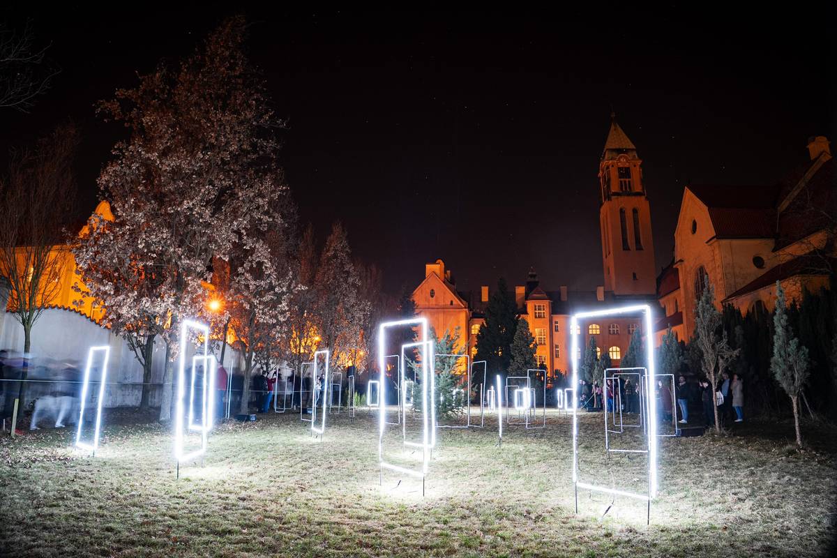 Zahradu dominikánského kláštera osvětlily rámy z instalace Fragmenty.