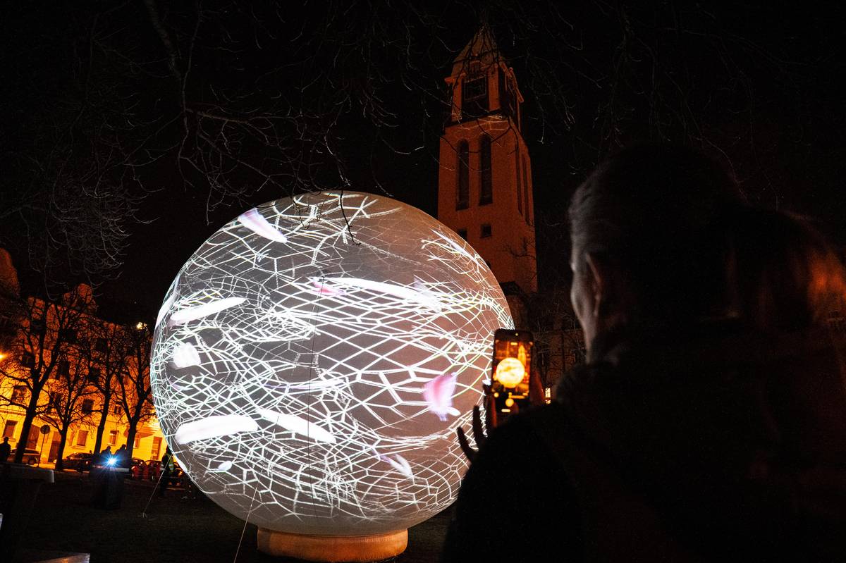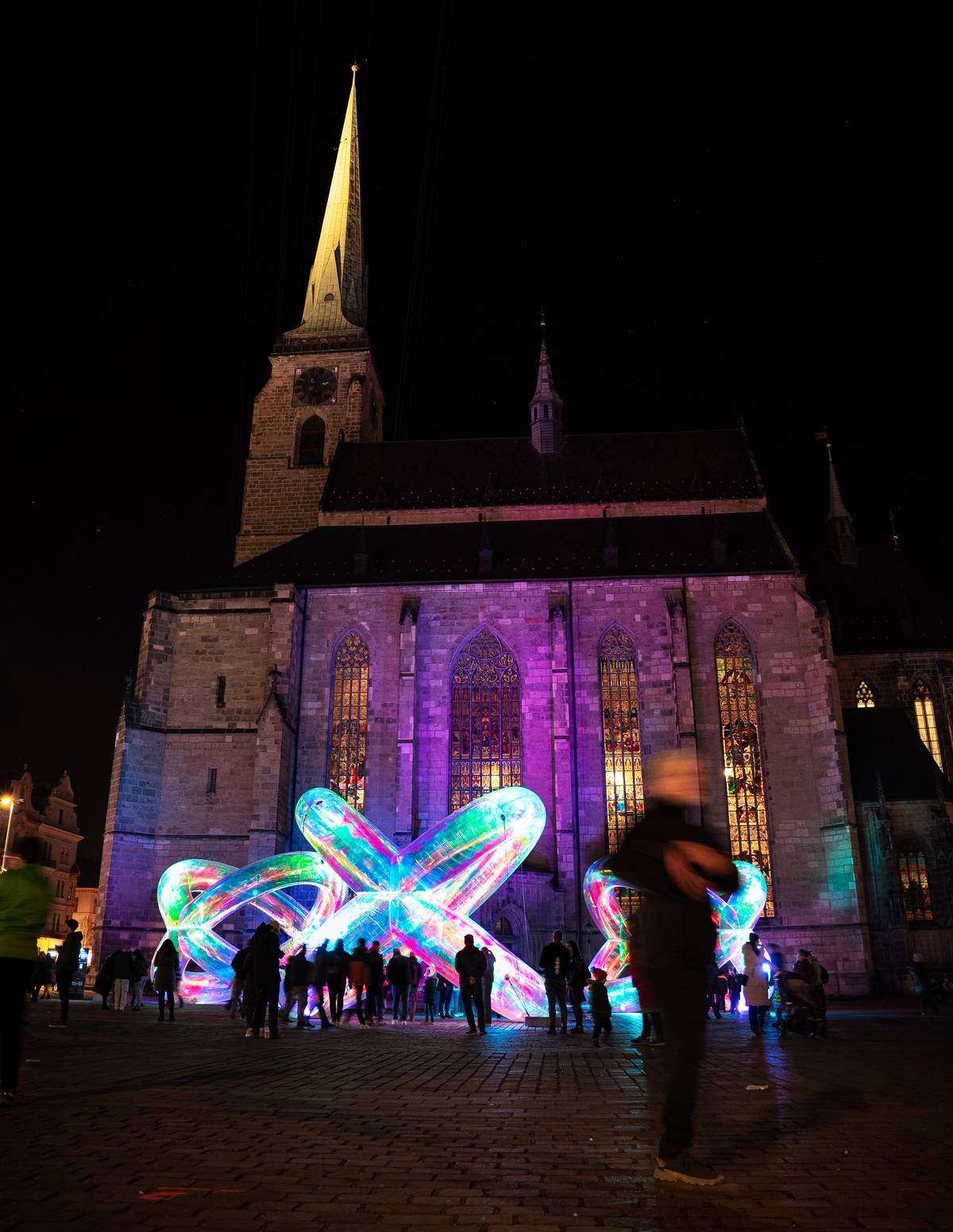 Náměstí republiky obsadily zkřížené torusy z dichromického materiálu. Lidé je mohli obdivovat jak za dne, tak v noci ve stínu katedrály sv. Bartoloměje.