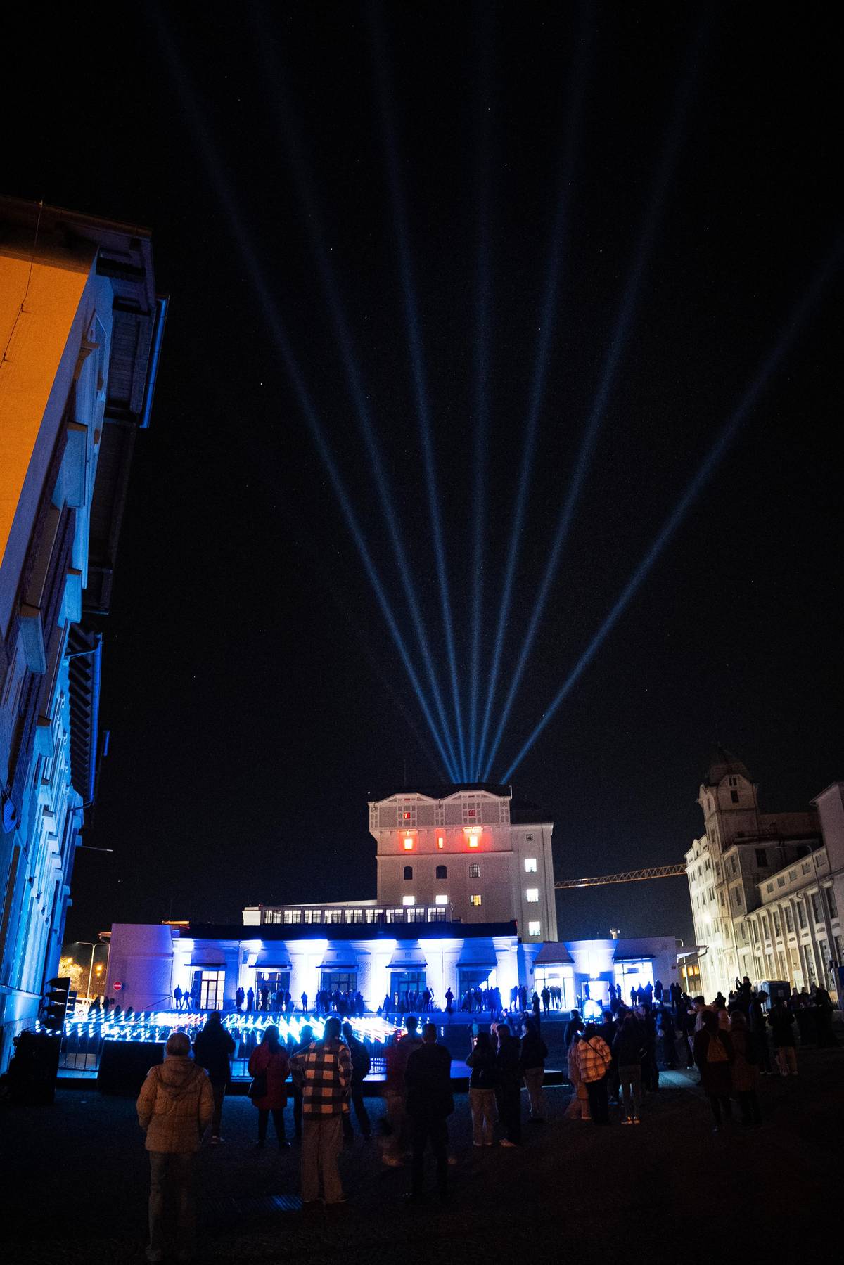 To, že se část festivalu odehrává v budovách bývalého pivovaru Světovar, se dalo spatřit už zdálky díky nainstalovaným světelným kuželům.