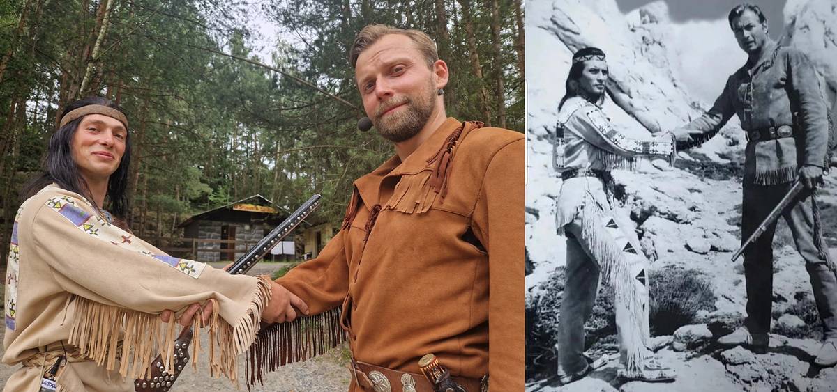 Srovnávací fotky; vevo Vinnetou a Old Shatterhand z boskovického westernového městečka Michal Bednář a Martin Veselý a vpravo Pierre Brice a Lex Barker.