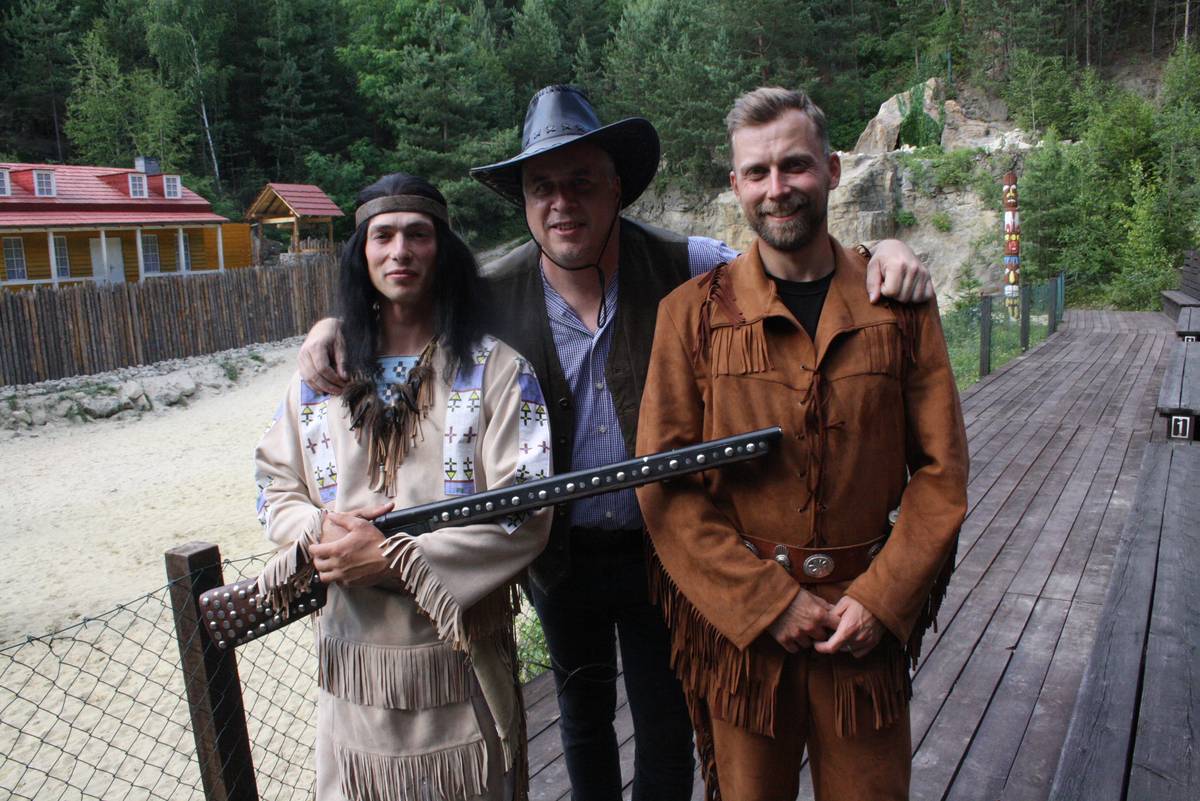 Vinnetou (Michal Bednář), Old Shatterhand (Martin Veselý) a fanoušek mayovek, kytarista slovenské skupiny Iné Kafe Vlado Bis (uprostřed) ve Westernovém městečku Boskovice.