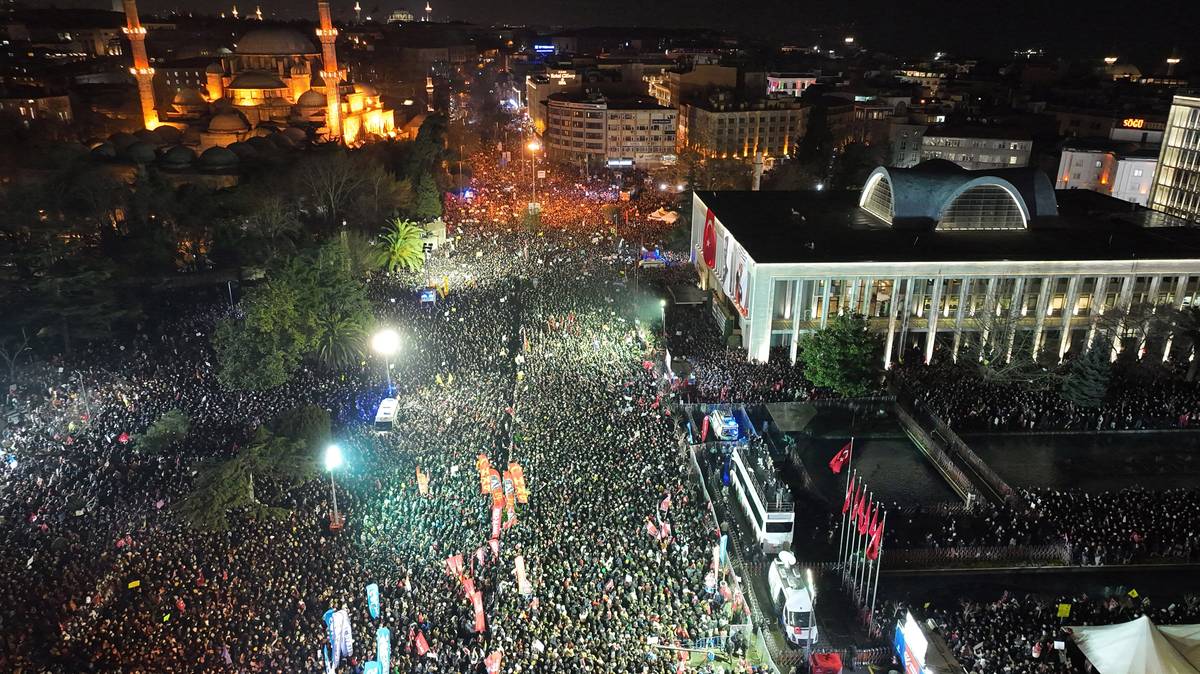 (Letecký snímek tisíců protestujících během pátého nočního shromáždění na náměstí Sarachane v Istanbulu, 23. března.)