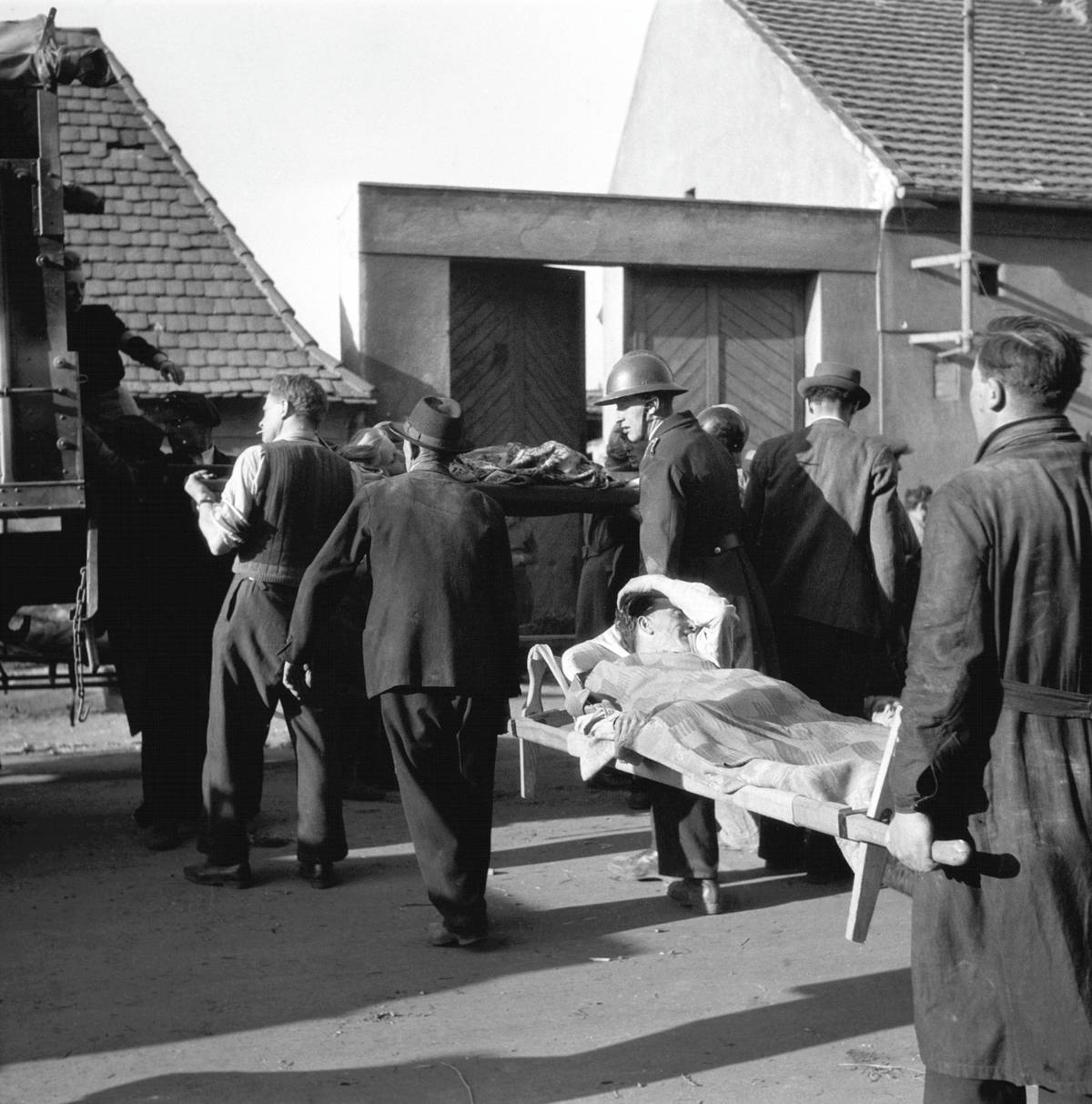 Praha po leteckém bombardování 25. března 1945. Rohový dům na Královské třídě a ulice U Skládky v Libni