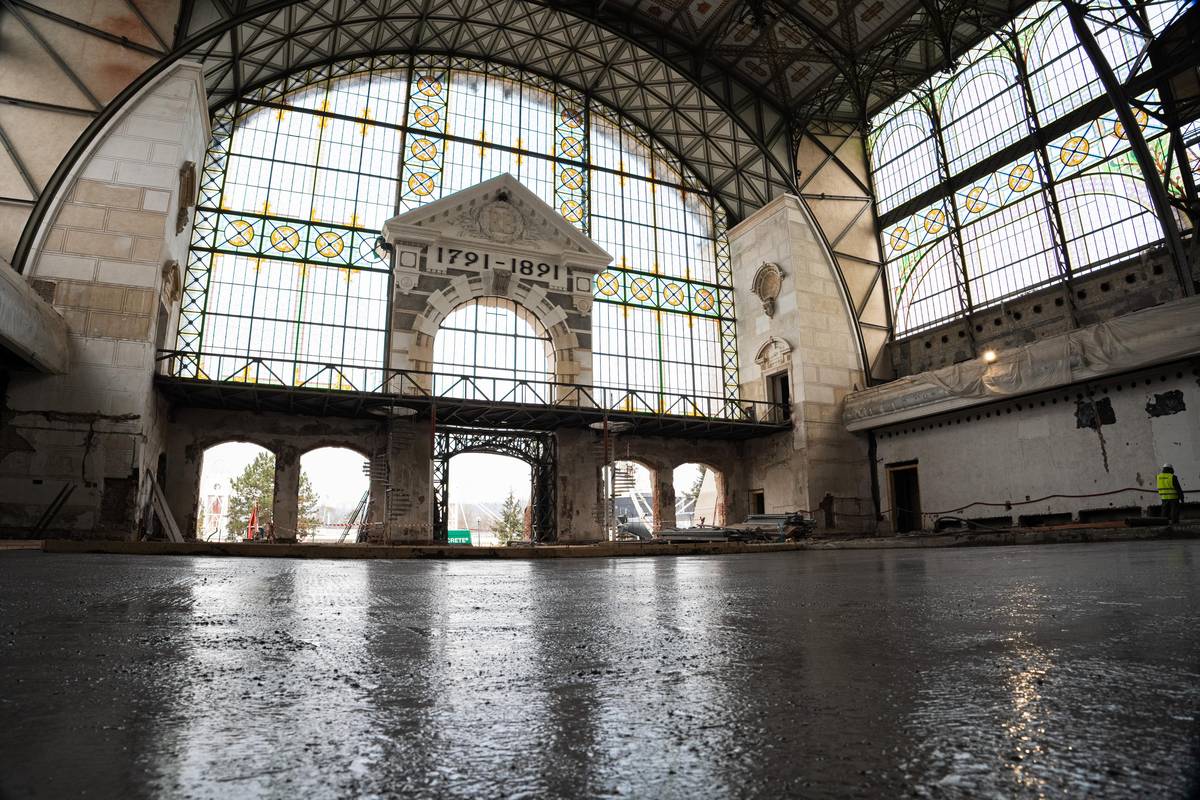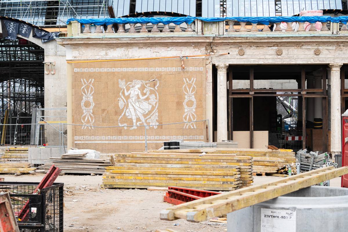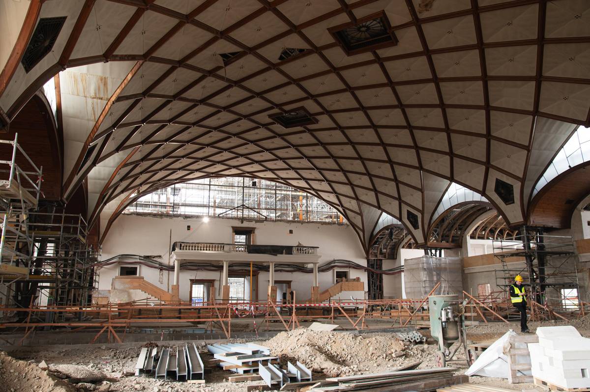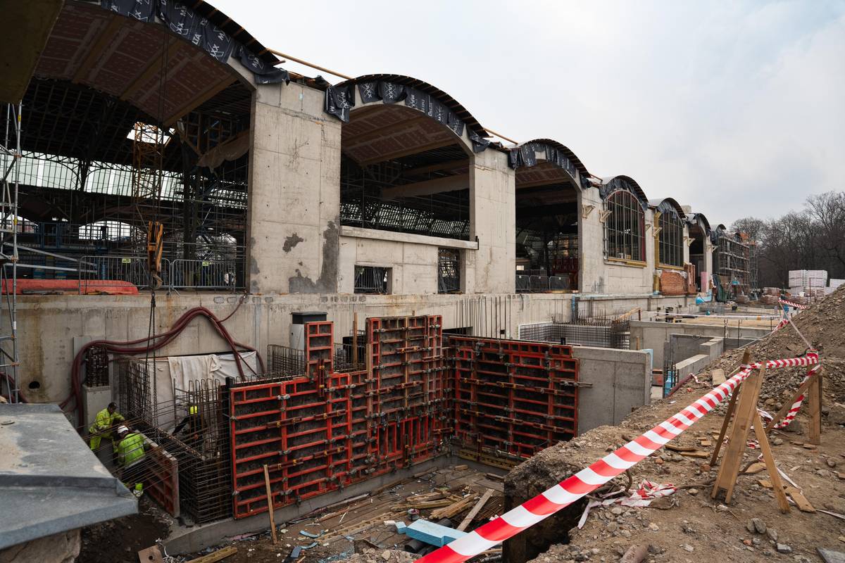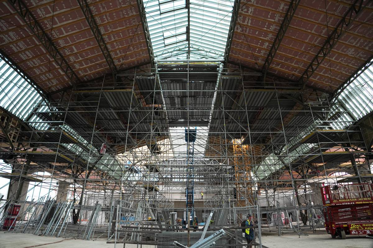 Průmyslový palác je stále z větší části obklopen lešením. U střední haly by se to mělo změnit do několika měsíců, demontovat by se mělo kolem hodinové věže.