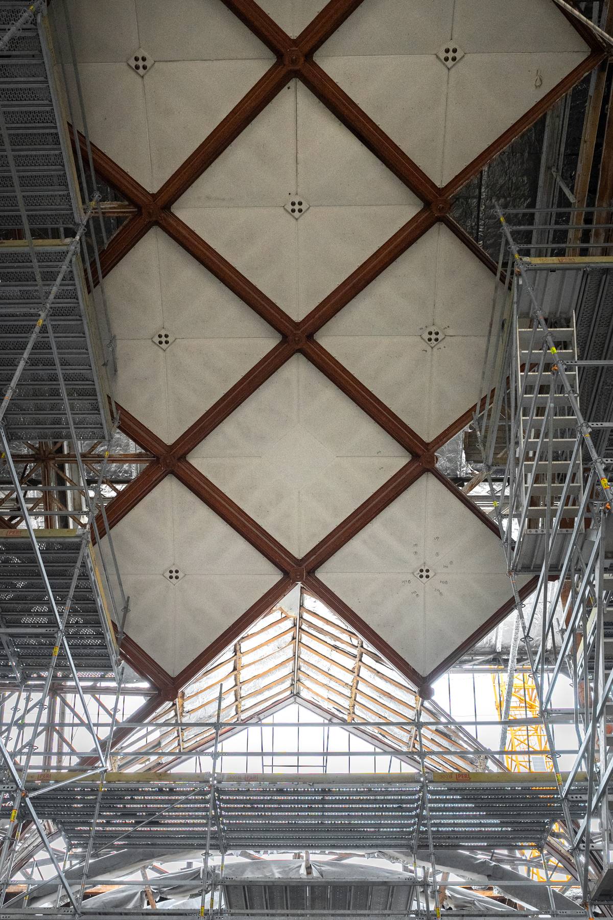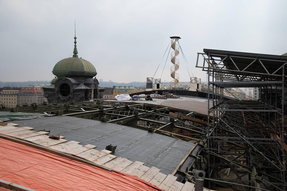Demontují se zde podhledy a připravuje se zahájení sanací ocelových konstrukcí. Předpokládaný termín dokončení celé střechy pravého křídla je na jaře 2026.