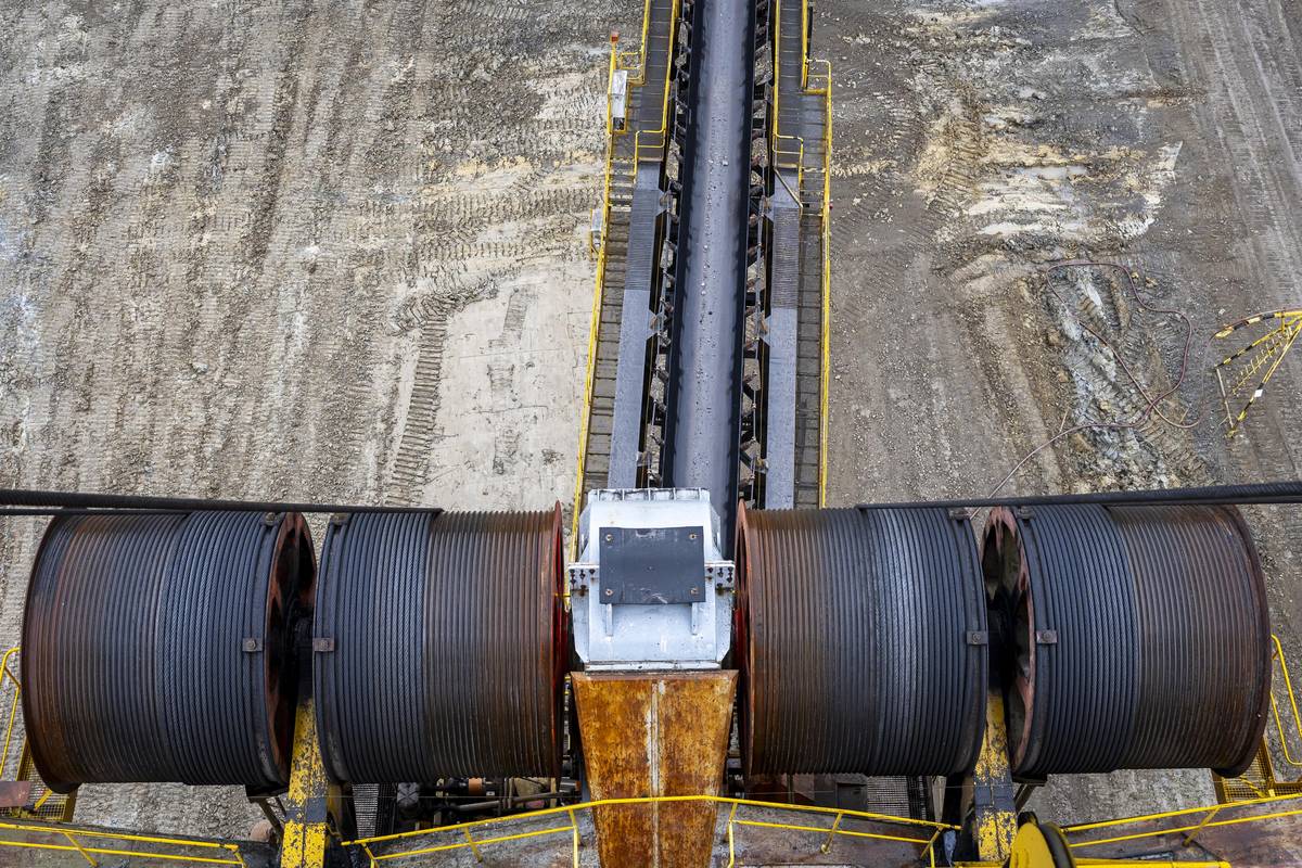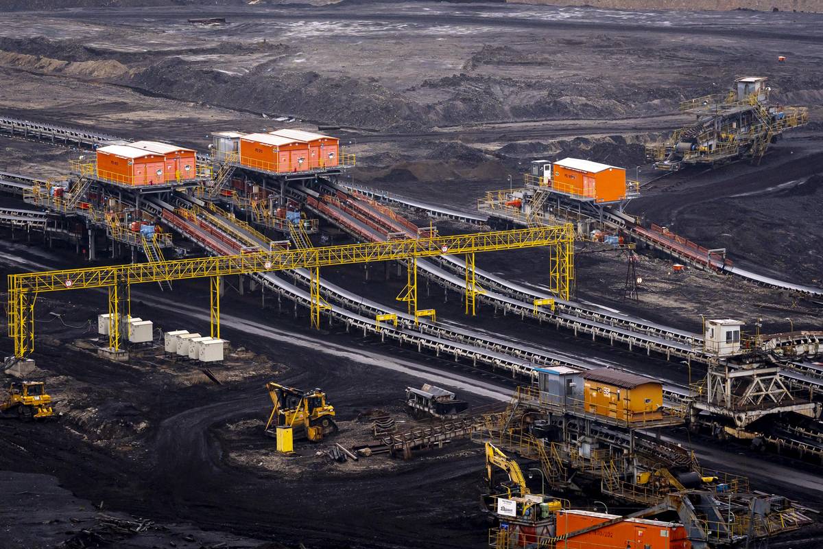 Pásové dopravníky na uhlí a jedno z menších rypadel v hnědouhelném dole Jiří.