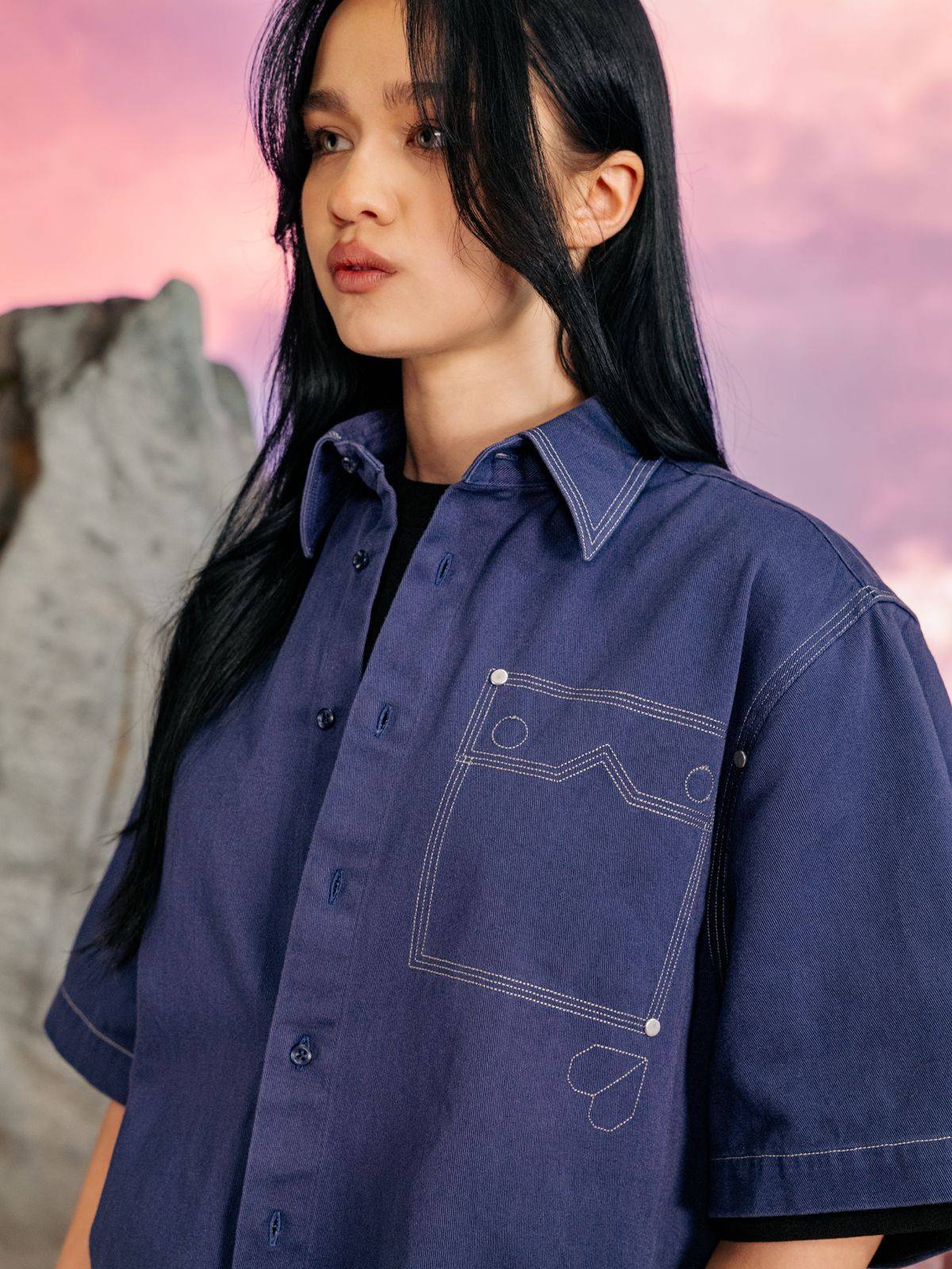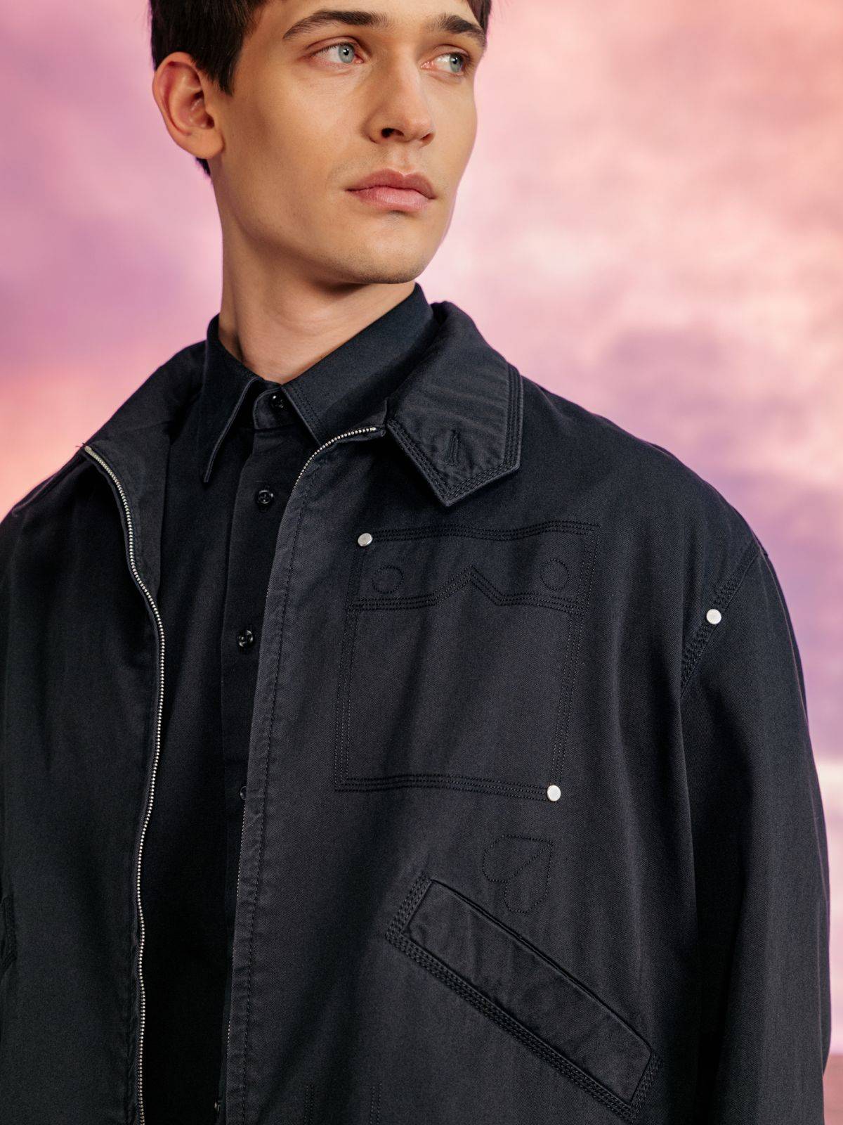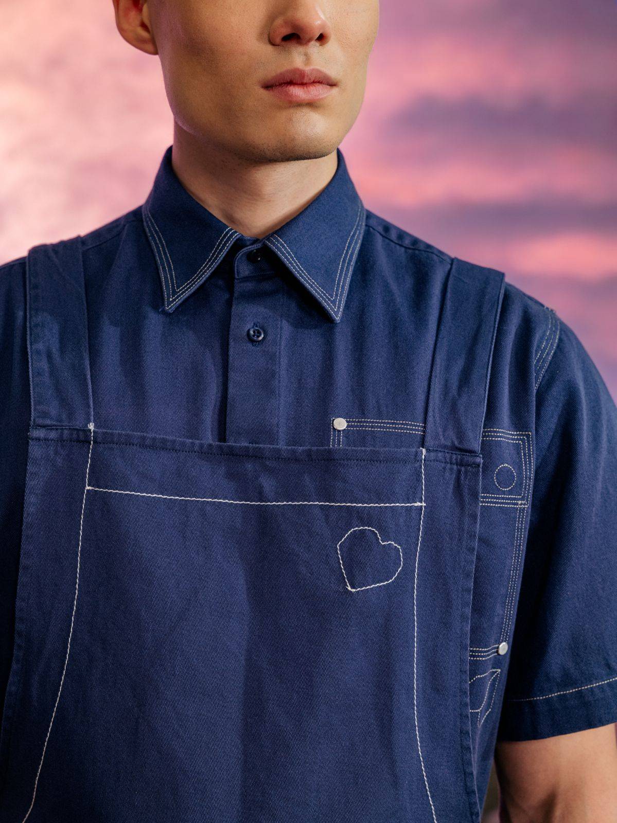 Vyšívané dekorace na hrudníku, které odkazují na tolik potřebné kapsy na pracovních oděvech.
