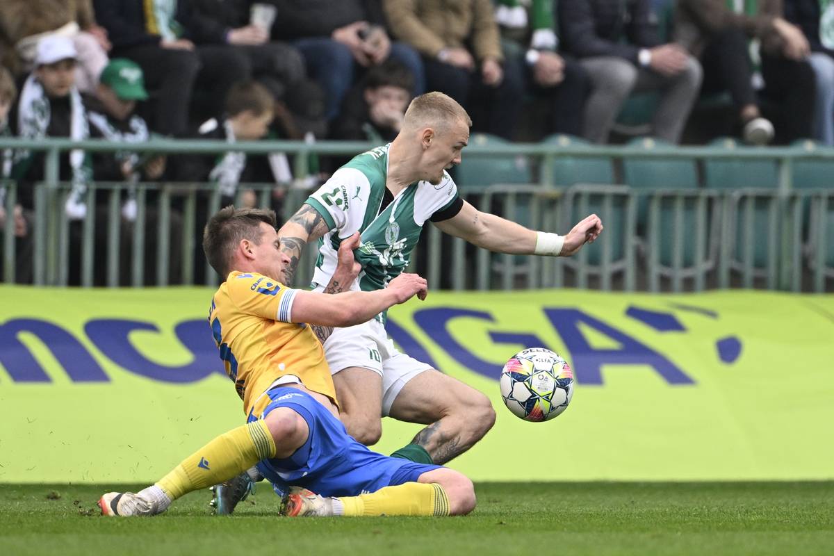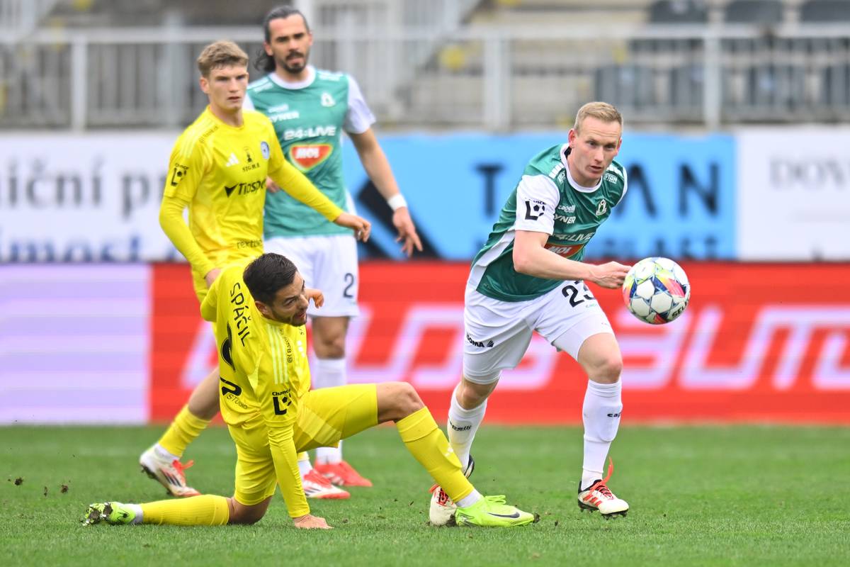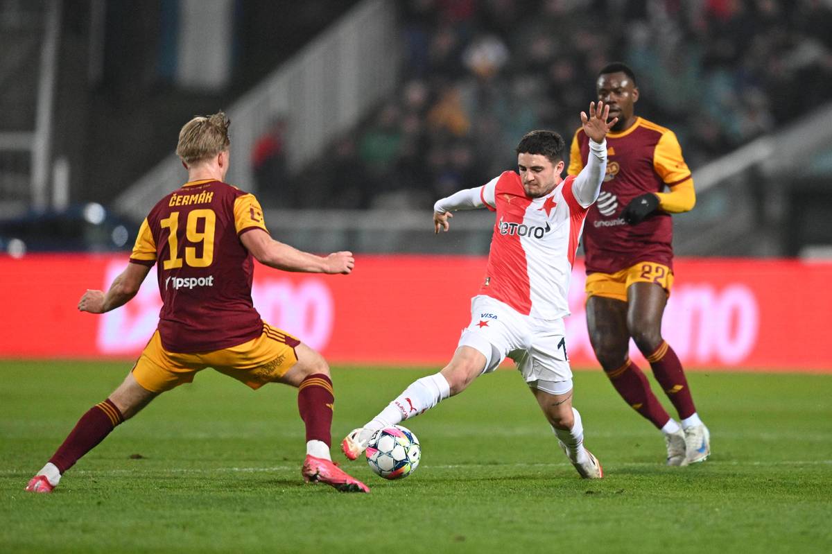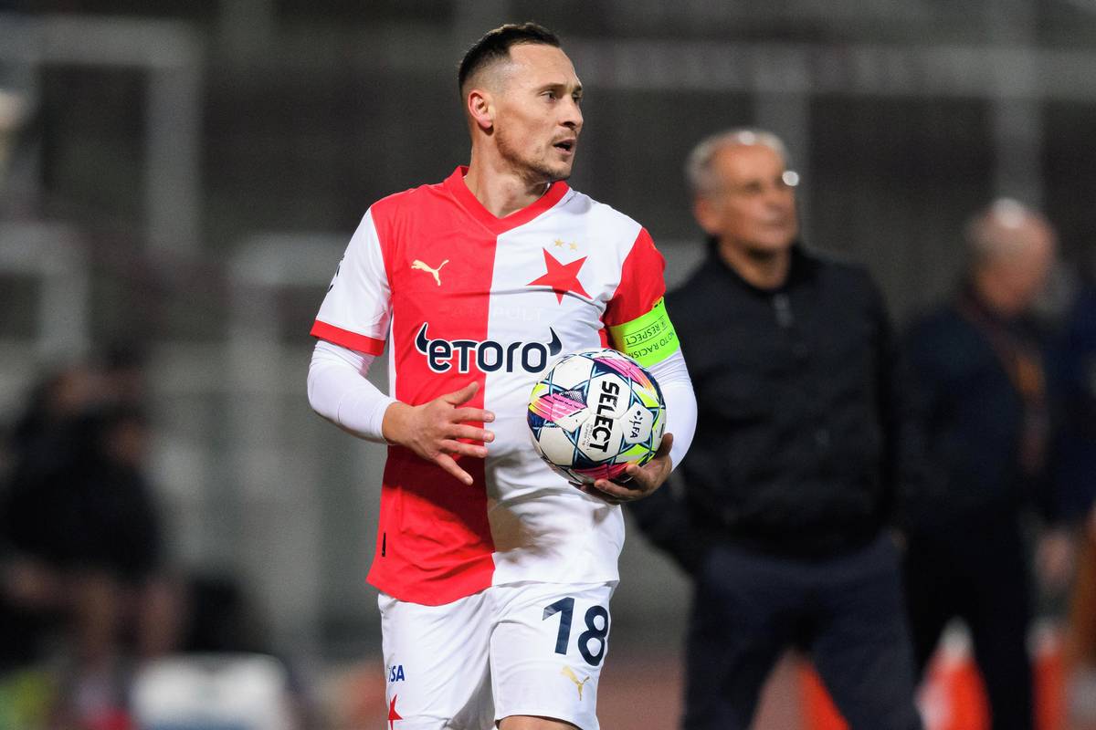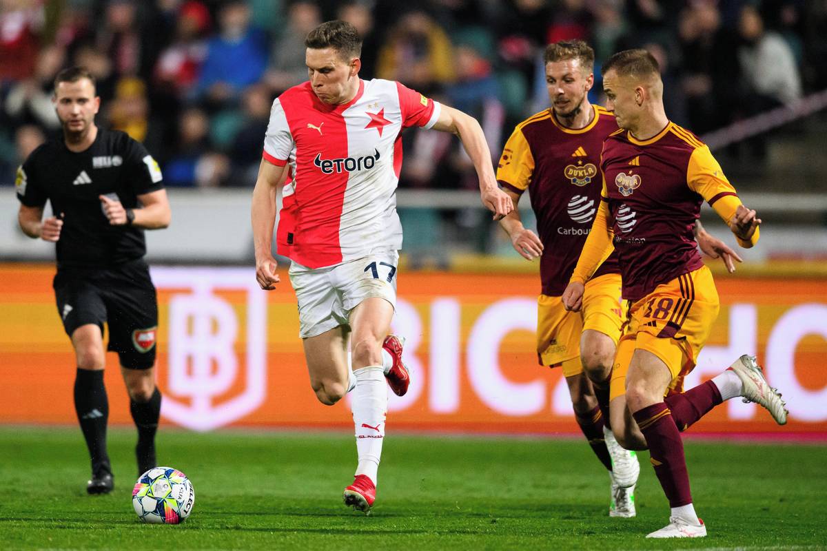 Slávista Lukáš Provod se snaží udržet balon proti přesile