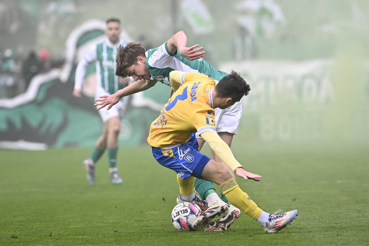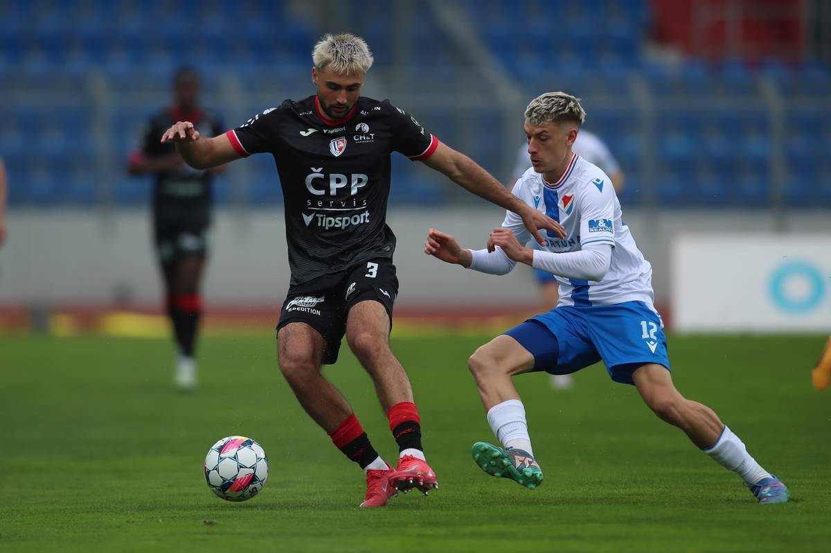 Slávista Christos Zafeiris se snaží projít přes Marcela Čermáka z Dukly.