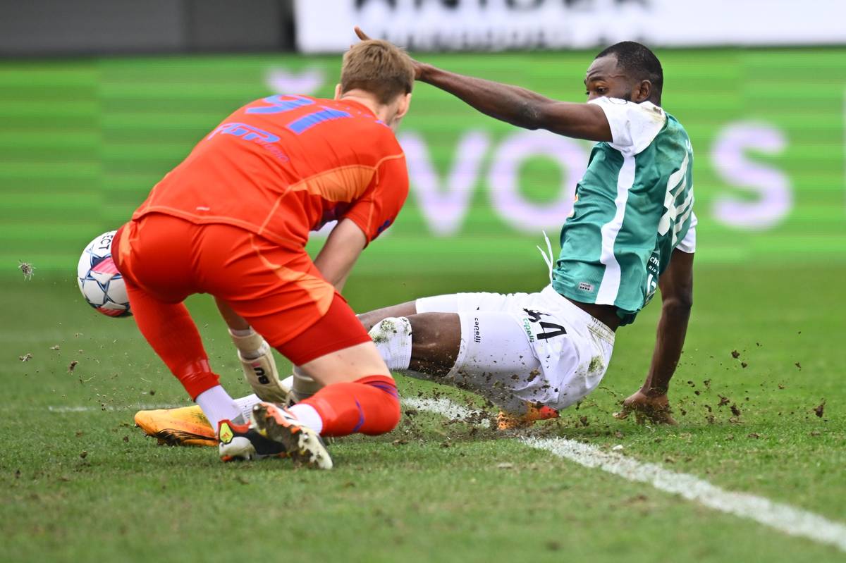Útočník Jablonce Lamin Jawo skluzem zasáhl míč před olomouckým brankářem Janem Koutným a skóroval. Jenže gól neplatil, protože byl Jawo v ofsajdu.