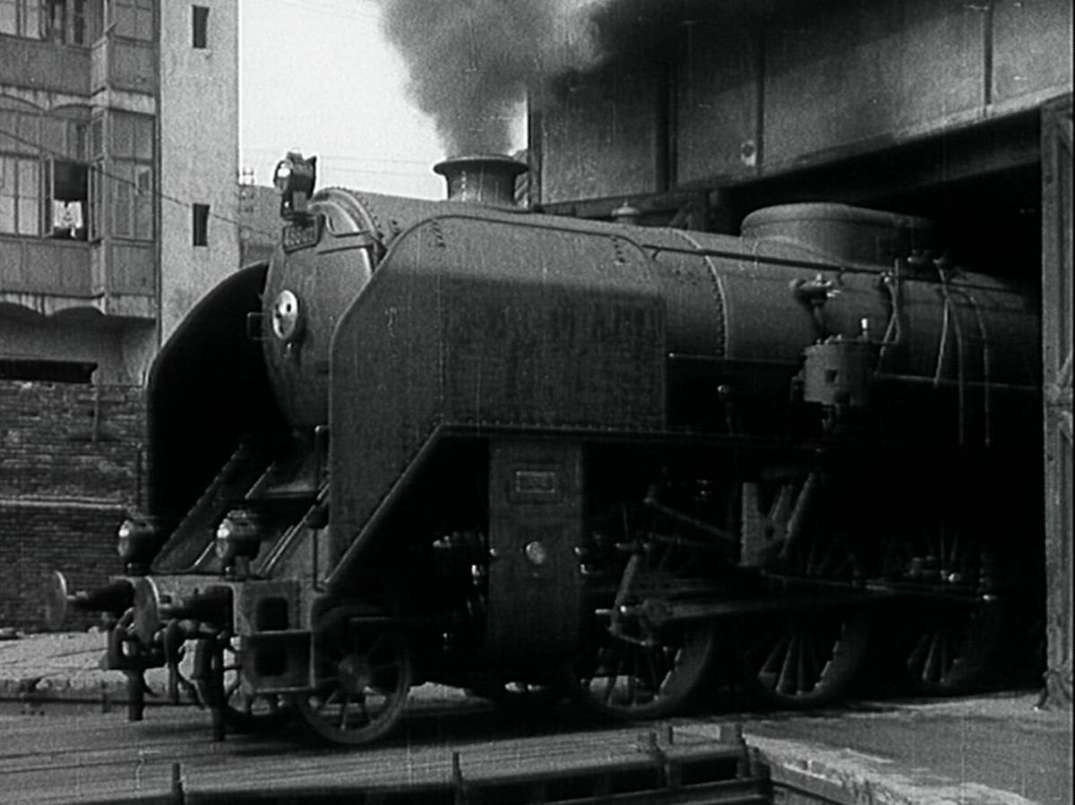Nová parní lokomotiva vyjíždí na točnu z tovární haly ČKD, píše se rok 1942.