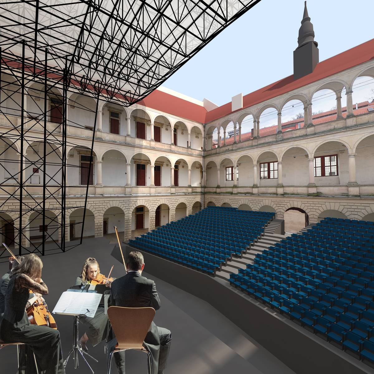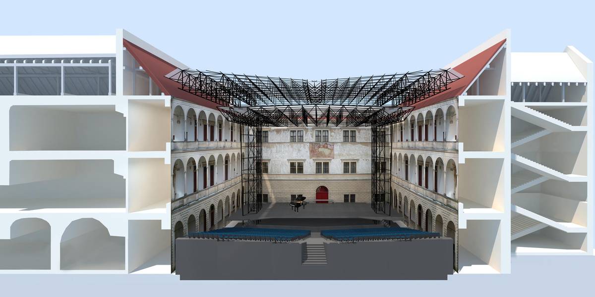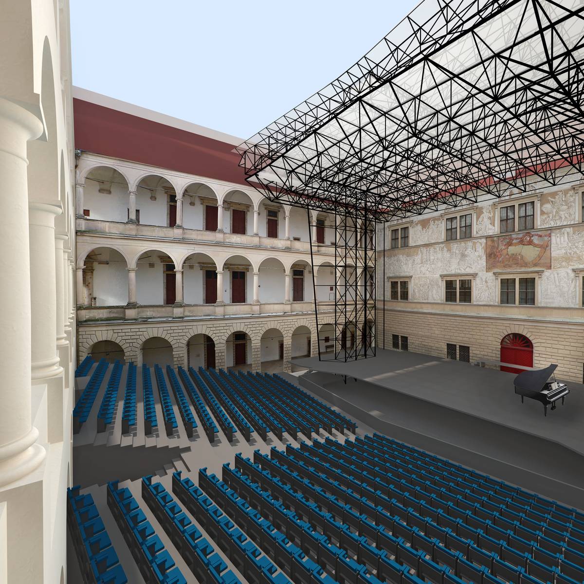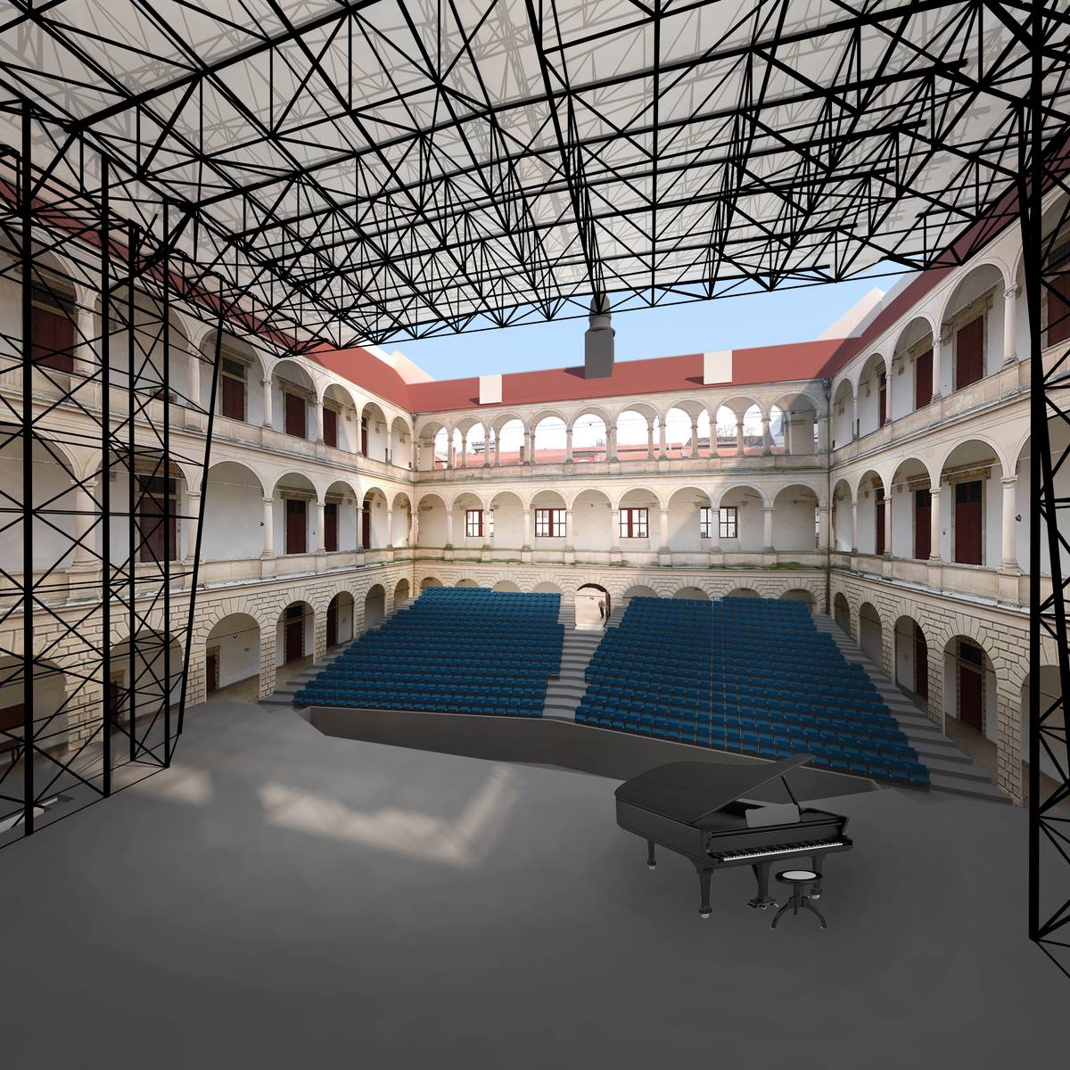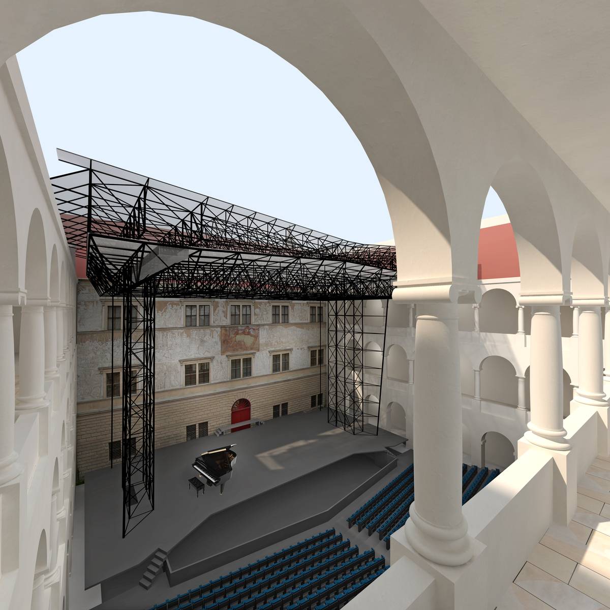 Nízké hlediště nechá více vyniknout renesanční architekturu (vizualizace).