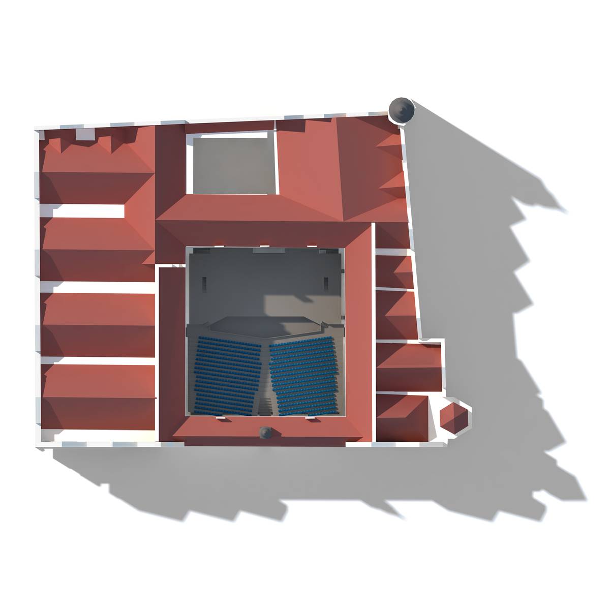 Do sálu se bude vstupovat mezi dvěma částmi hlediště (vizualizace).
