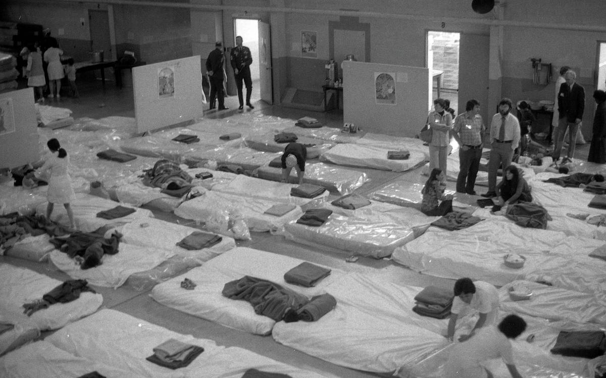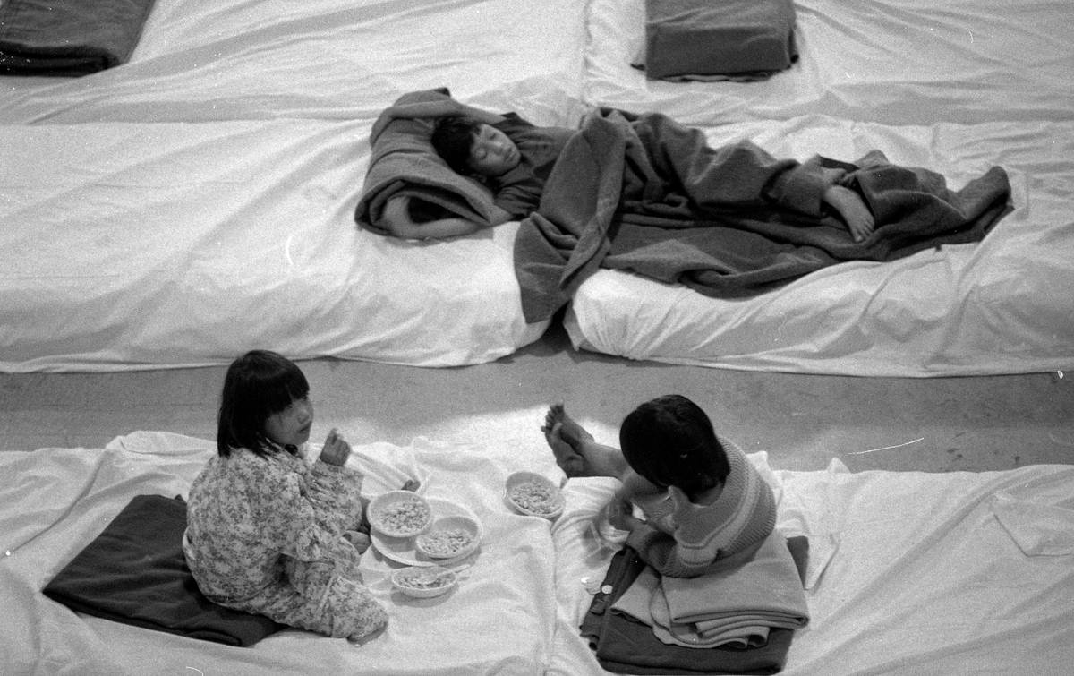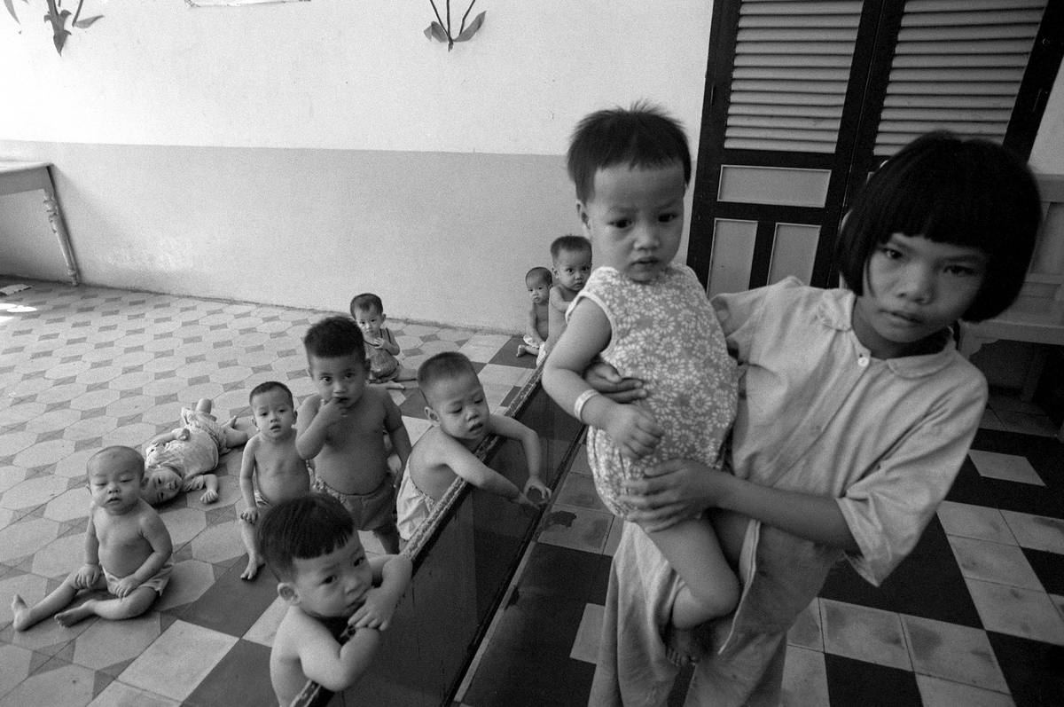 Pohled do jedné ze saigonských škol, kde se před transportem do USA děti shromažďovaly. Pád Saigonu se nezadržitelně blížil a transport na letiště byl v narůstajícím zmatku obtížný.