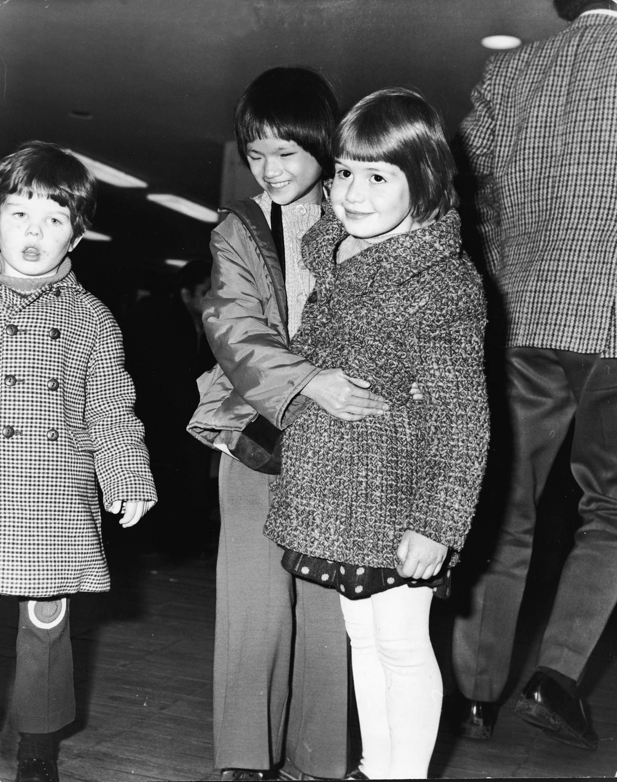 Vietnamské děti s doprovodem na londýnském letišti ve Velké Británii. Doklady sirotků včetně podrobností o narozených biologických rodičích, datech a místech narození byly v rámci operace Babylift zničeny.