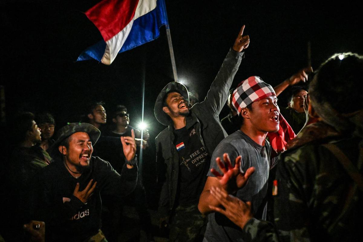Khu Reedu (27 let, uprostřed), velitel karenských sil, a jeho spolubojovníci oslavují vítězství nad vojenskou jednotkou věrnou juntě. Shadaw, Karenský stát, 14. února 2024.