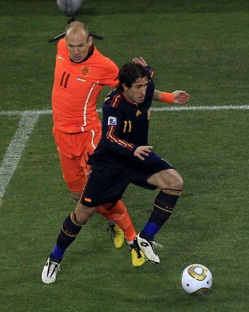 David Villa (vpředu) sice do finále vstoupil jako nejlepší střelec turnaje (společně s Thomasem Müllerem, Wesleym Sneijderem a Deigem Forlánem dali všichni pět branek), ale proti Nizozemsku se neprosadil. Po odchodu z Barcelony zamířil nejprve do Atlética Madrid a následně do MLS. V minulé sezoně působil ve Visselu Kóbe společně se svým bývalým spoluhráčem z Barcelony Andrésem Iniestou, ale už na podzim oznámil, že s aktivní kariérou končí.