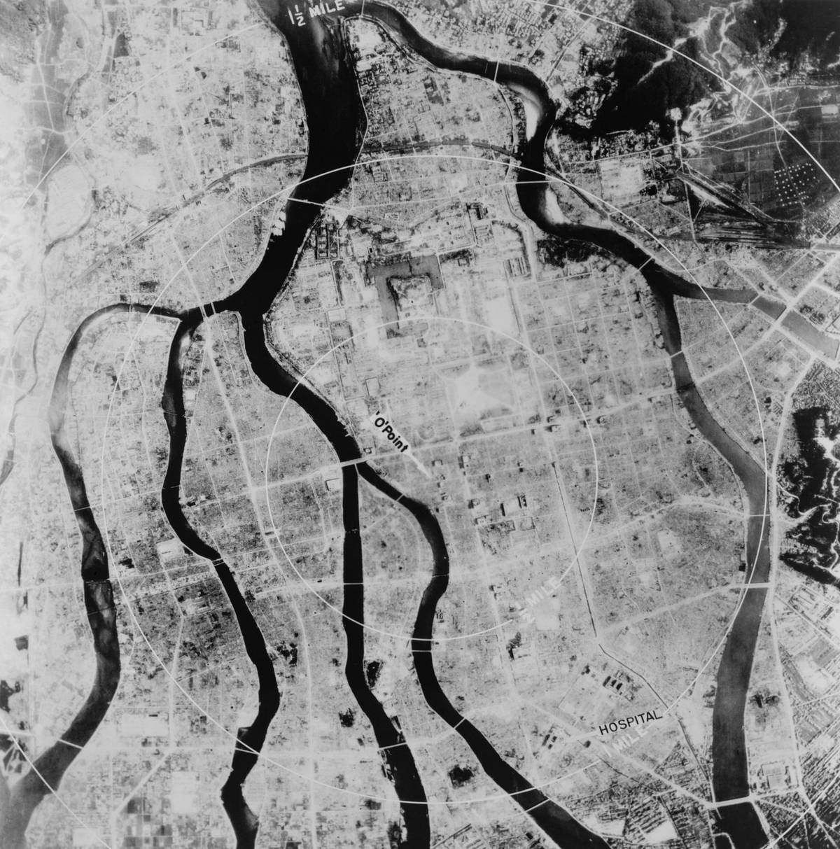 Pohled z nemocnice Červeného kříže v Hirošimě směrem na severozápad.
