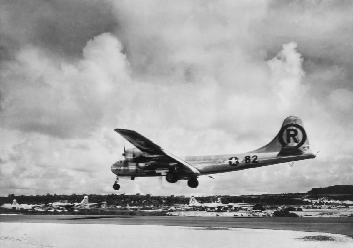 Bombardér Enola Gay přistává zpět na základně poté, co svrhl atomovou bombu na Hirošimu.