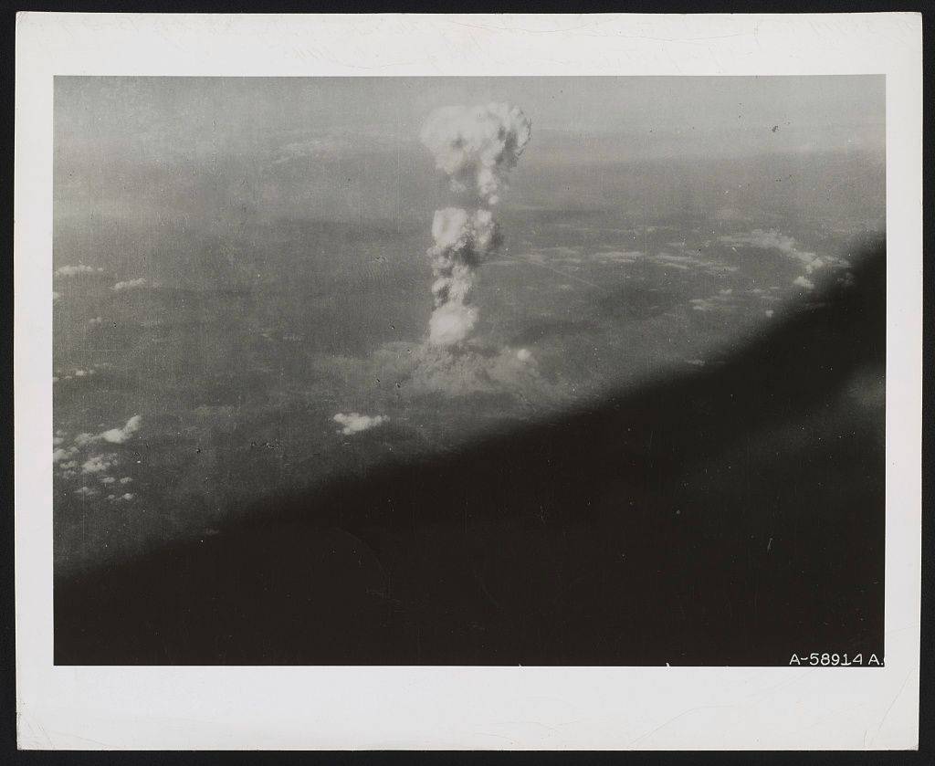 Výbuch atomové bomby nad Hirošimou vyfocený z nedalekého města Kure.