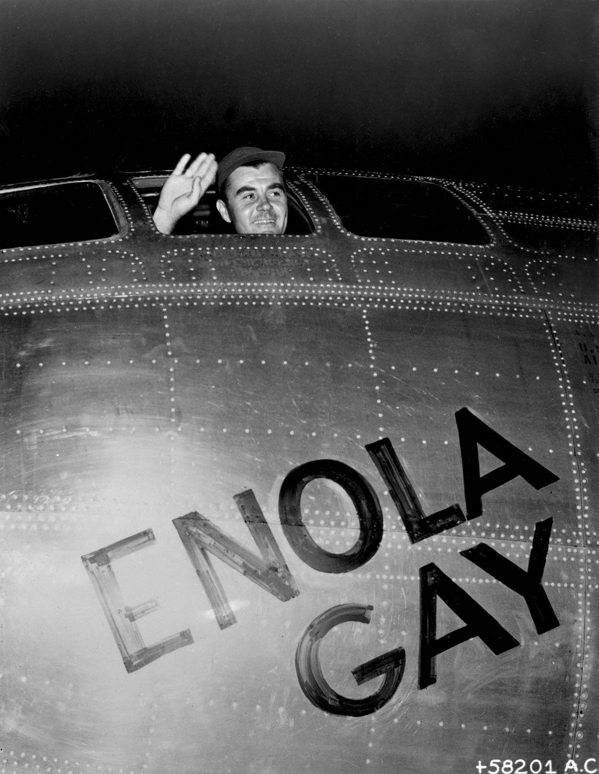První pilot Paul Tibbets mává z bombardéru Enola Gay před vzlétnutím.