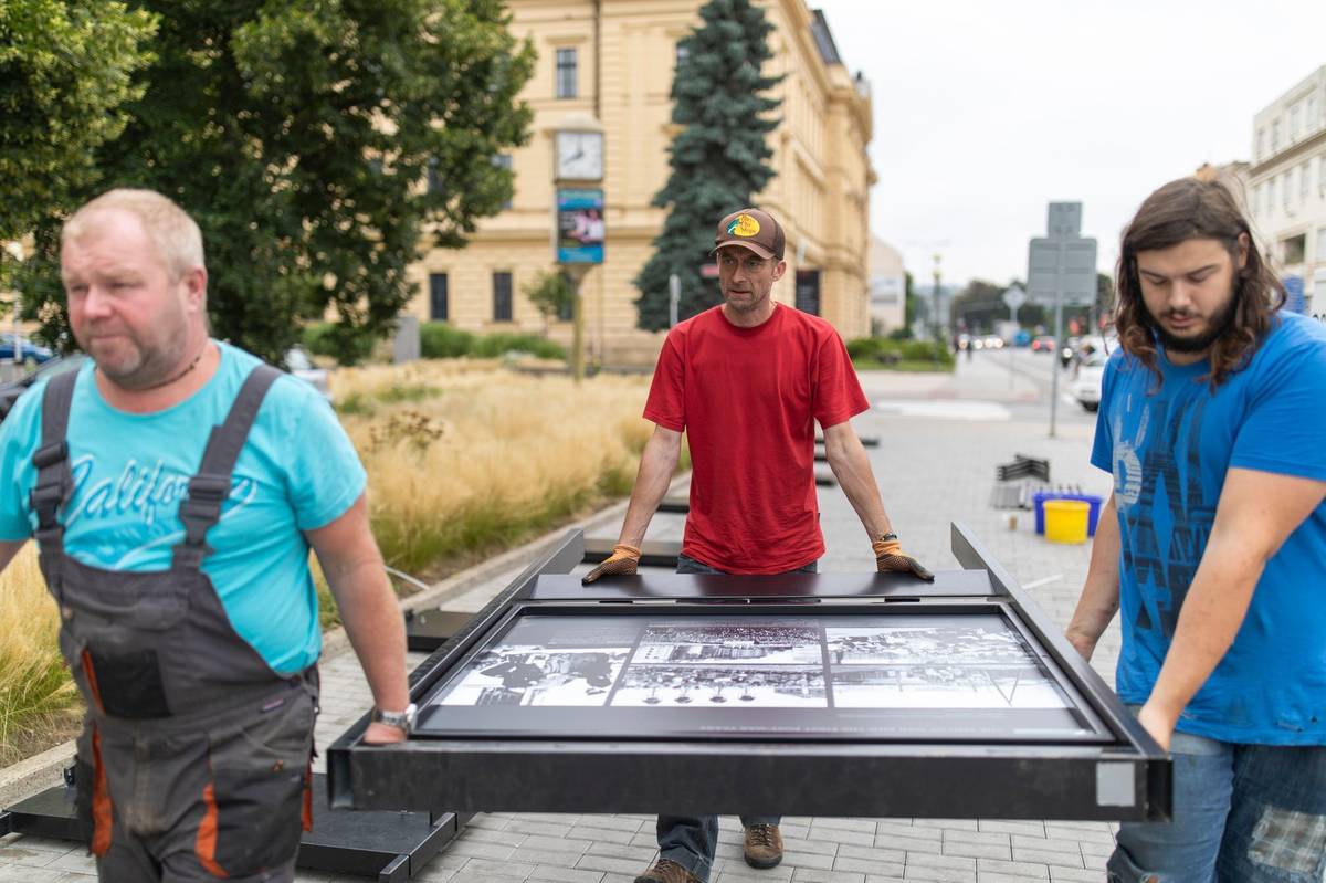 Šéfredaktor Fotobanky ČTK Petr Mlch a šéfredaktorka zpravodajství České tiskové kanceláře Radka Matesová Marková pózují u jednoho z panelů fotografické výstavy.