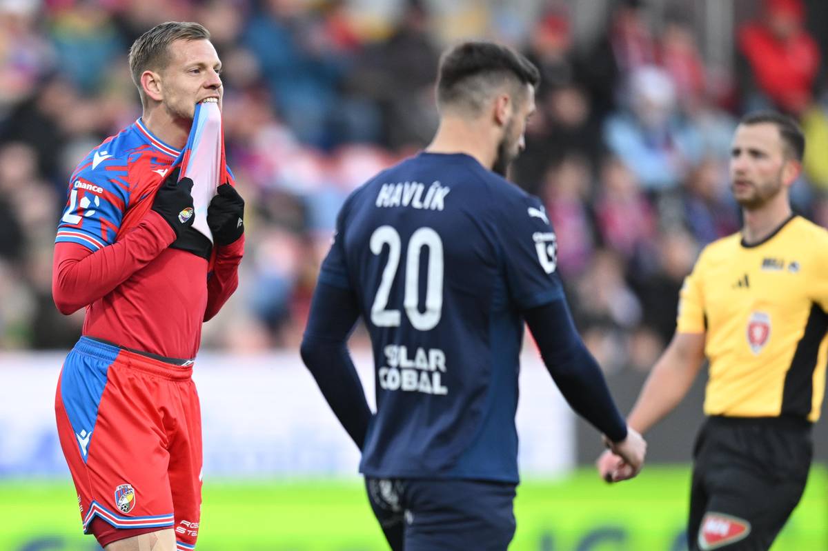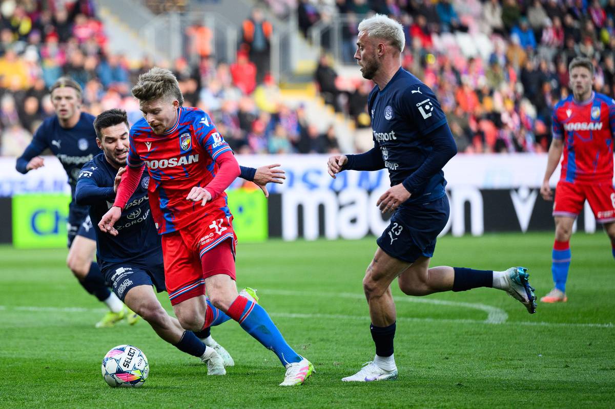 Michal Trávník ze Slovácka, Pavel Šulc z Viktorie Plzeň a Petr Reinberk ze Slovácka během utkání 28. kola Chance ligy, FC Viktoria Plzeň - 1. FC Slovácko, hrané 6. dubna 2025 v Plzni.