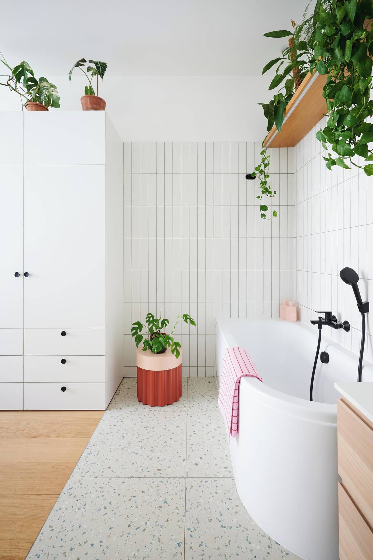 Kolem vany je dlažba a i zde je dostatek místa pro majitelčiny kytky