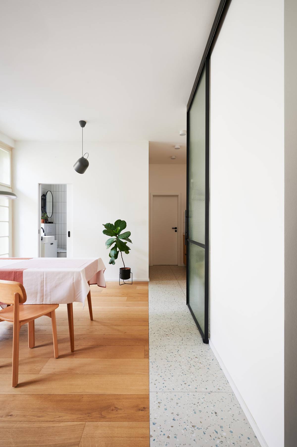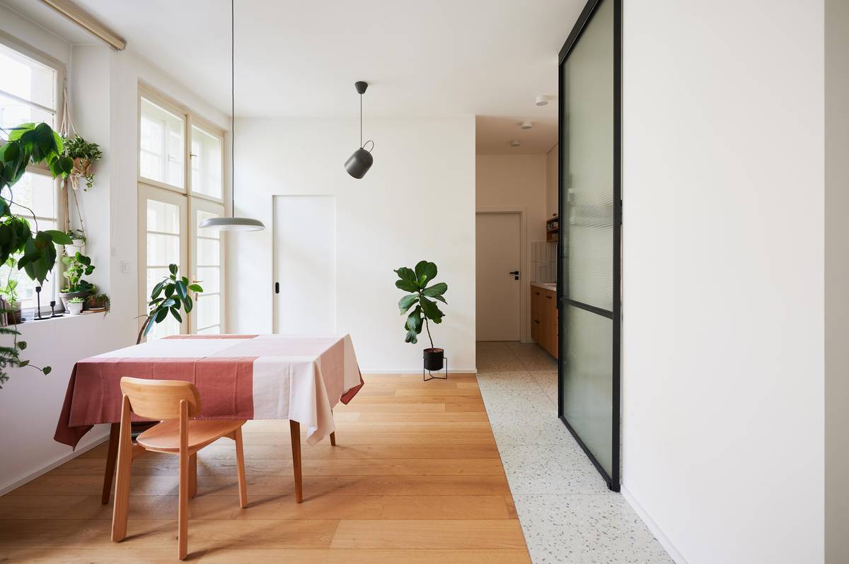 Z praktických důvodů nakombinovali v některých částech bytu dřevěnou podlahu s dlažbou