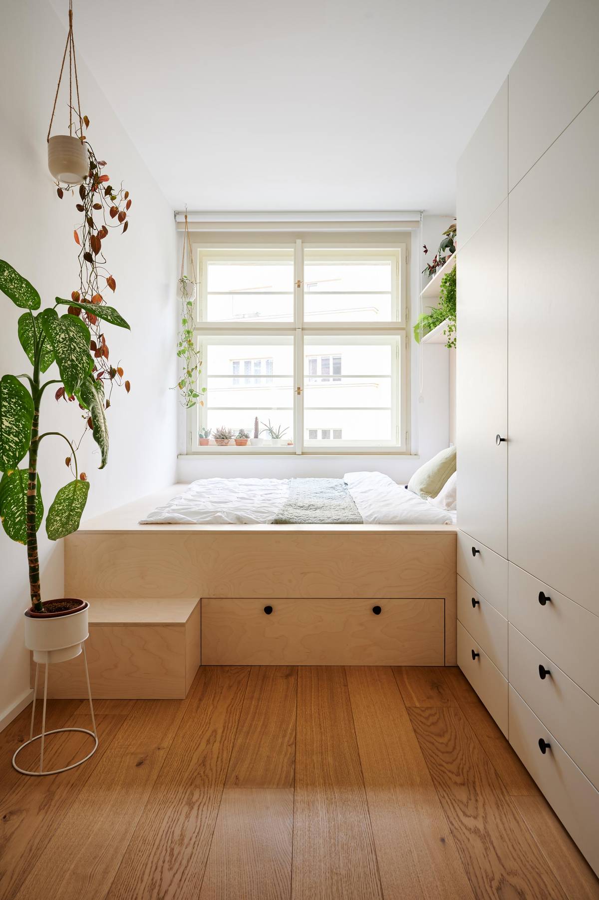 V ložnici je na míru vyrobená vyvýšená postel pod oknem
